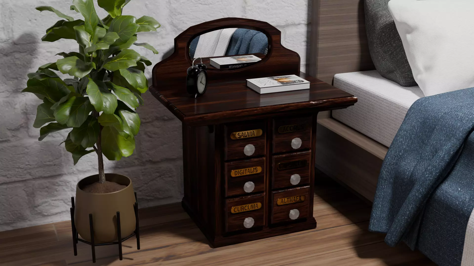 Bring vintage apothecary charm into your 3D interiors with this Unique Apothecary Table Nightstand, a richly detailed piece that blends historic character with practical versatility. Crafted in dark stained wood, this model captures the look of an old-world herbalist’s cabinet while fitting seamlessly into eclectic, rustic, or traditional bedroom and living room scenes.