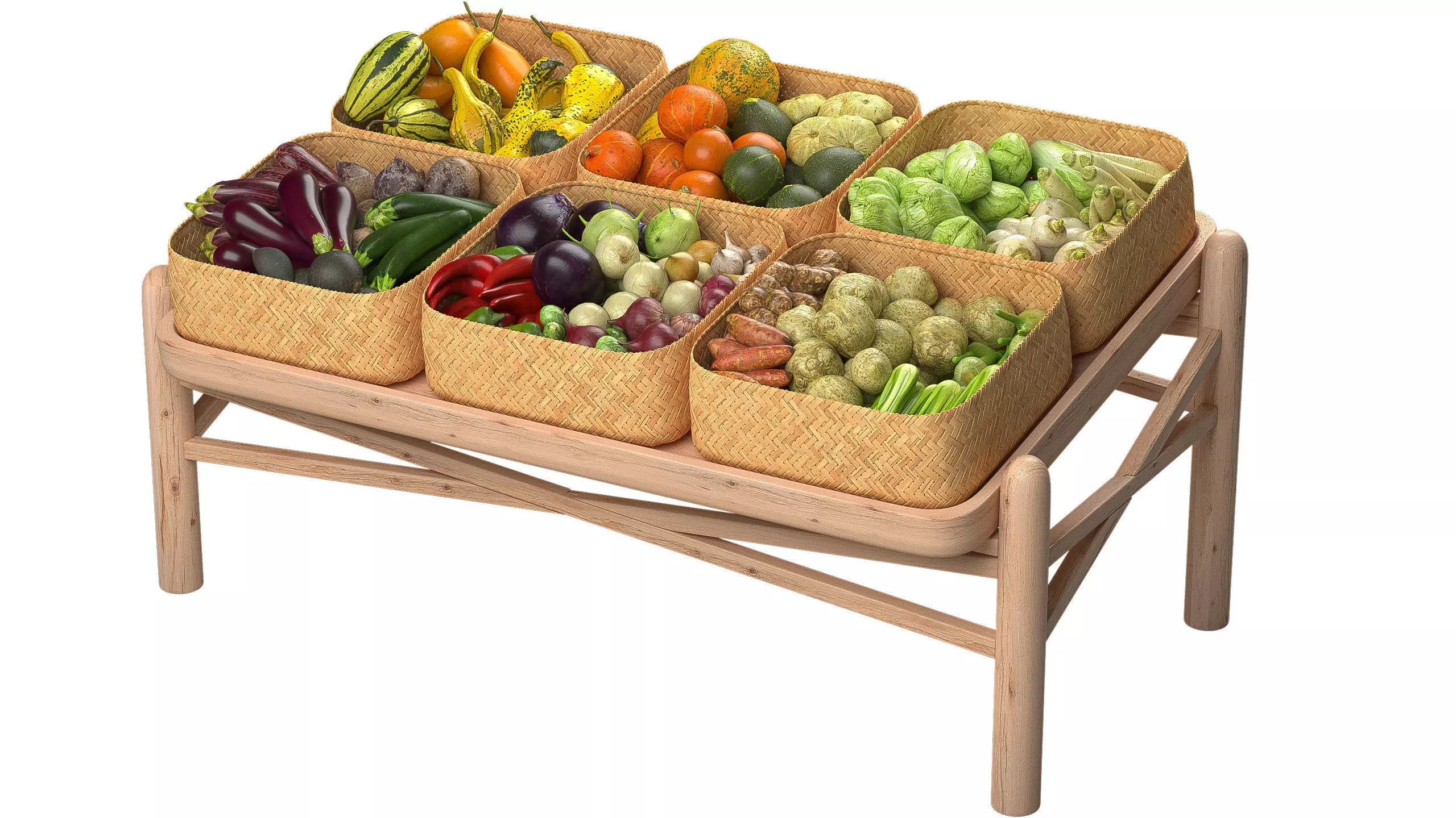Vegetable stall with wicker baskets of vegetables.
