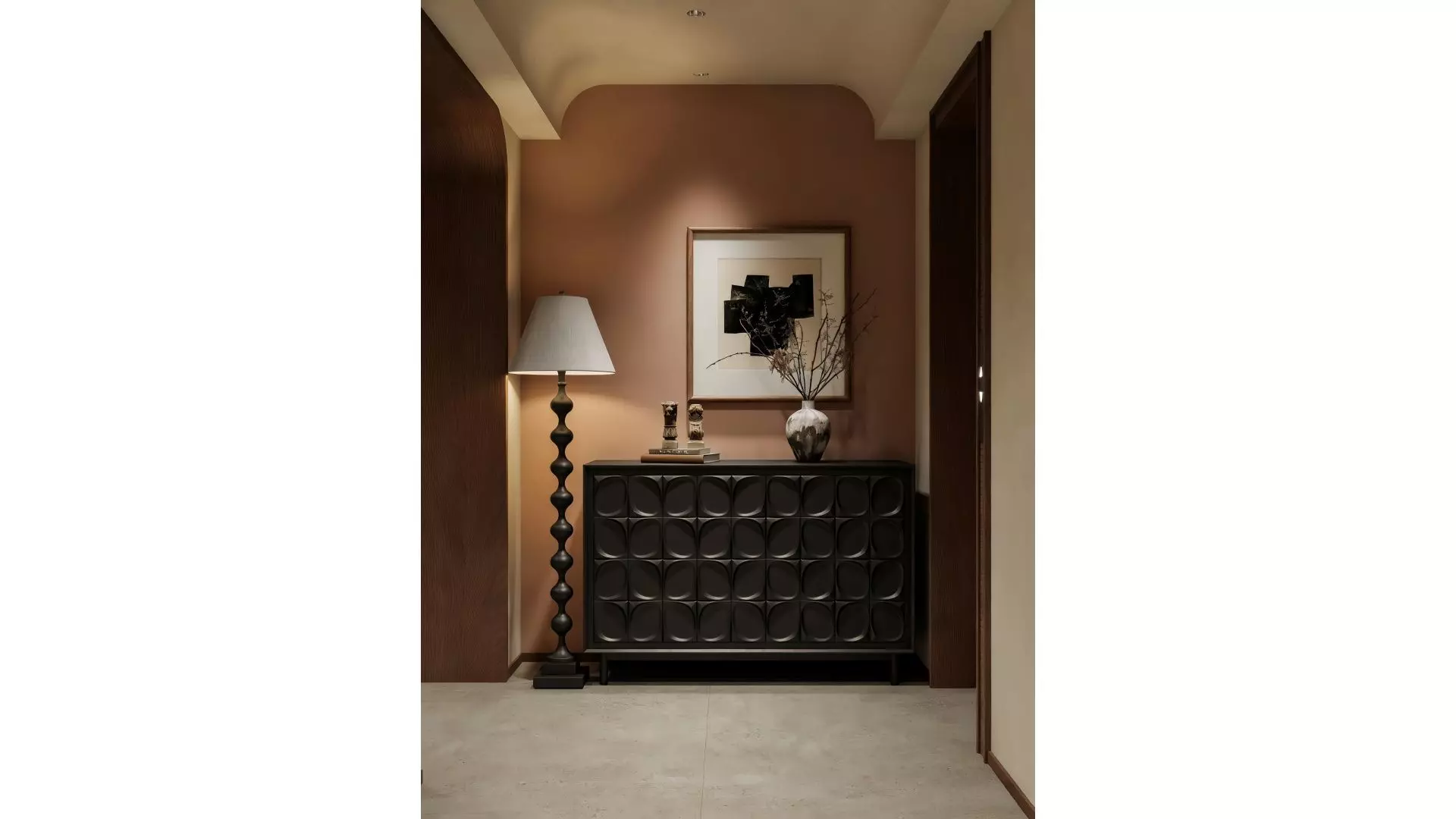 This is an entryway space brimming with mid-century modern charm. The walls are adorned in a gentle blush pink as the primary color, paired with soft, curved ceiling molding, creating a warm and nostalgic atmosphere. At the center sits a black cabinet with wave-patterned detailing, whose textured, undulating surface exudes a strong sense of design. The cabinet top displays vintage sculptural accents and an artistic vase, harmonizing with the overall aesthetic. To the left, a black spiral-shaped floor lamp illuminates the space, while an abstract artwork hanging above elevates the artistic appeal. The concrete grey flooring and dark brown wooden door introduce a striking material contrast, resulting in a sophisticated and understated color palette that seamlessly blends functionality with aesthetic expression, perfectly embodying the fusion of modern and retro home design.