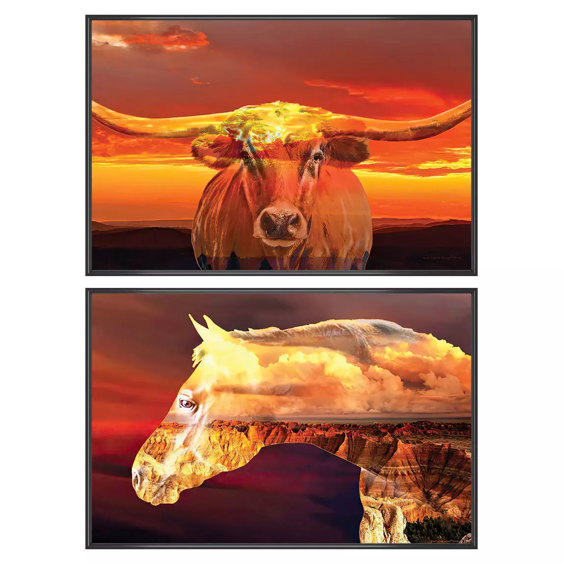 The set consists of 2 paintings and 4 frame options (plastic, wood, bronze, steel)