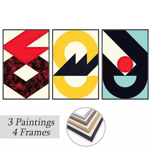 The set consists of 3 paintings and 4 frame options (plastic, wood, bronze, steel)