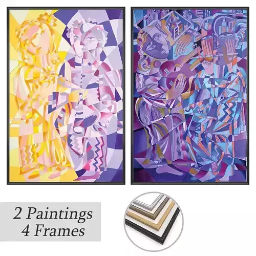 The set consists of 2 paintings and 4 frame options (plastic, wood, bronze, steel)
