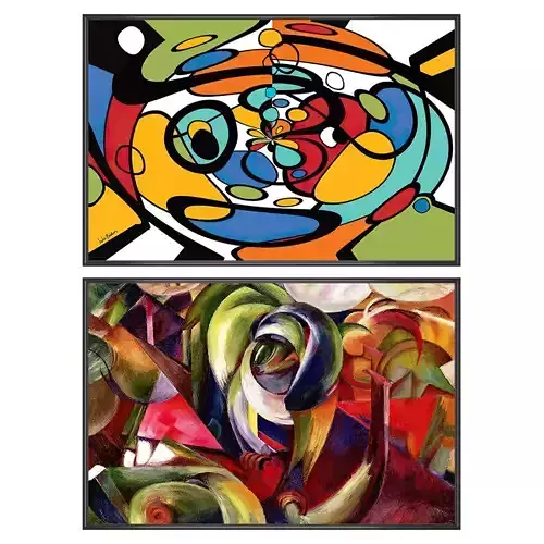 The set consists of 2 paintings and 4 frame options (plastic, wood, bronze, steel)