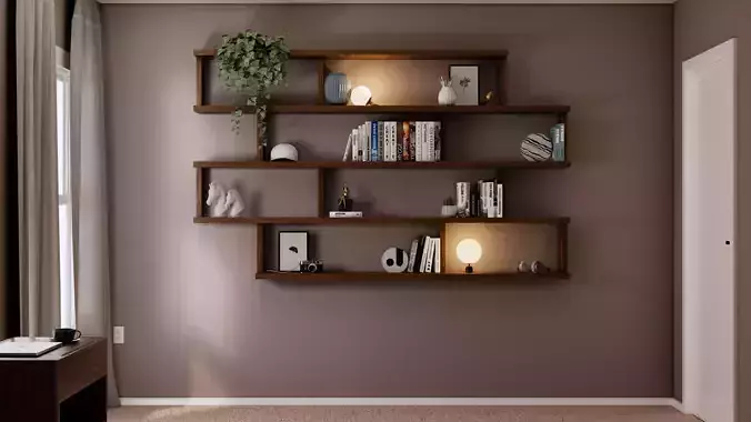 Modern Wall-Mounted Wooden Shelving System designed for interior visualization, furniture fabrication, and architectural projects.This modular shelving unit features a clean, contemporary layout suitable for living rooms, home offices, bedrooms, and commercial interiors.
