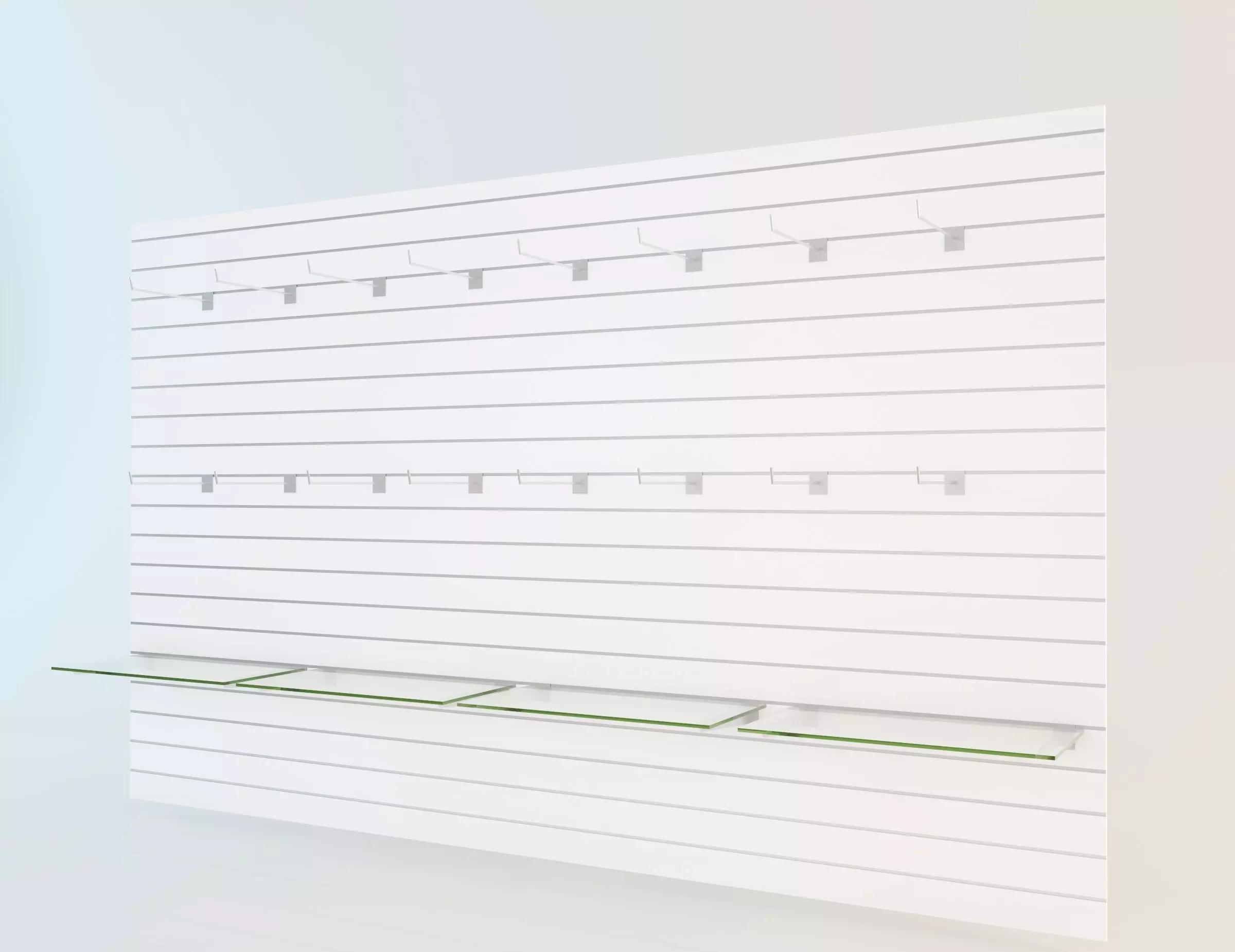 Wall slat unit dimension of 314*215cm.It can be used in any shop you design such as travel bag shop,jewelry shops, shoes shop , clothes shops etc . All the materials shown on the render are inside the max file without textures. .Consist of hooks and shelves