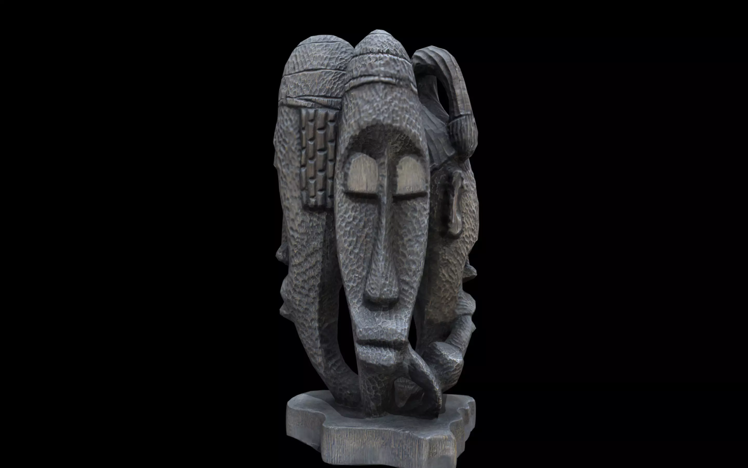 This object is a carved wooden sculpture representing the tribal faces of Nigeria’s three major ethnic groups — Hausa, Yoruba, and Igbo. It features three elongated faces with distinct proportions and expressions, each symbolizing the identity and heritage of these cultures. The faces merge into a single circular form, expressing unity within diversity, while the textured, hand-carved surface and solid base enhance its cultural and totemic presence.