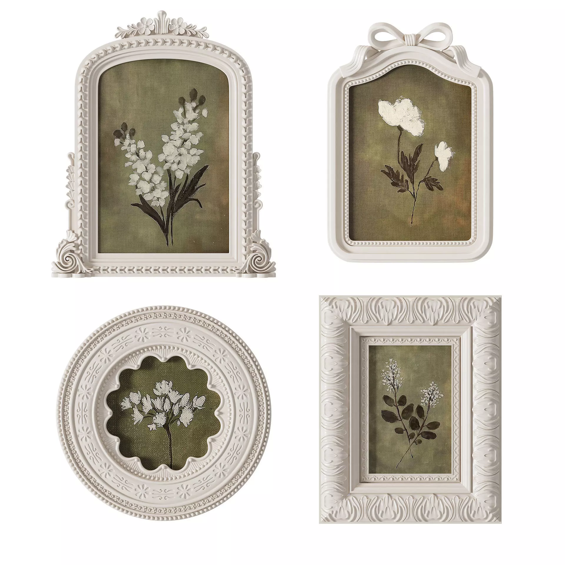 4 white frames in different shapes with floral prints in green colors