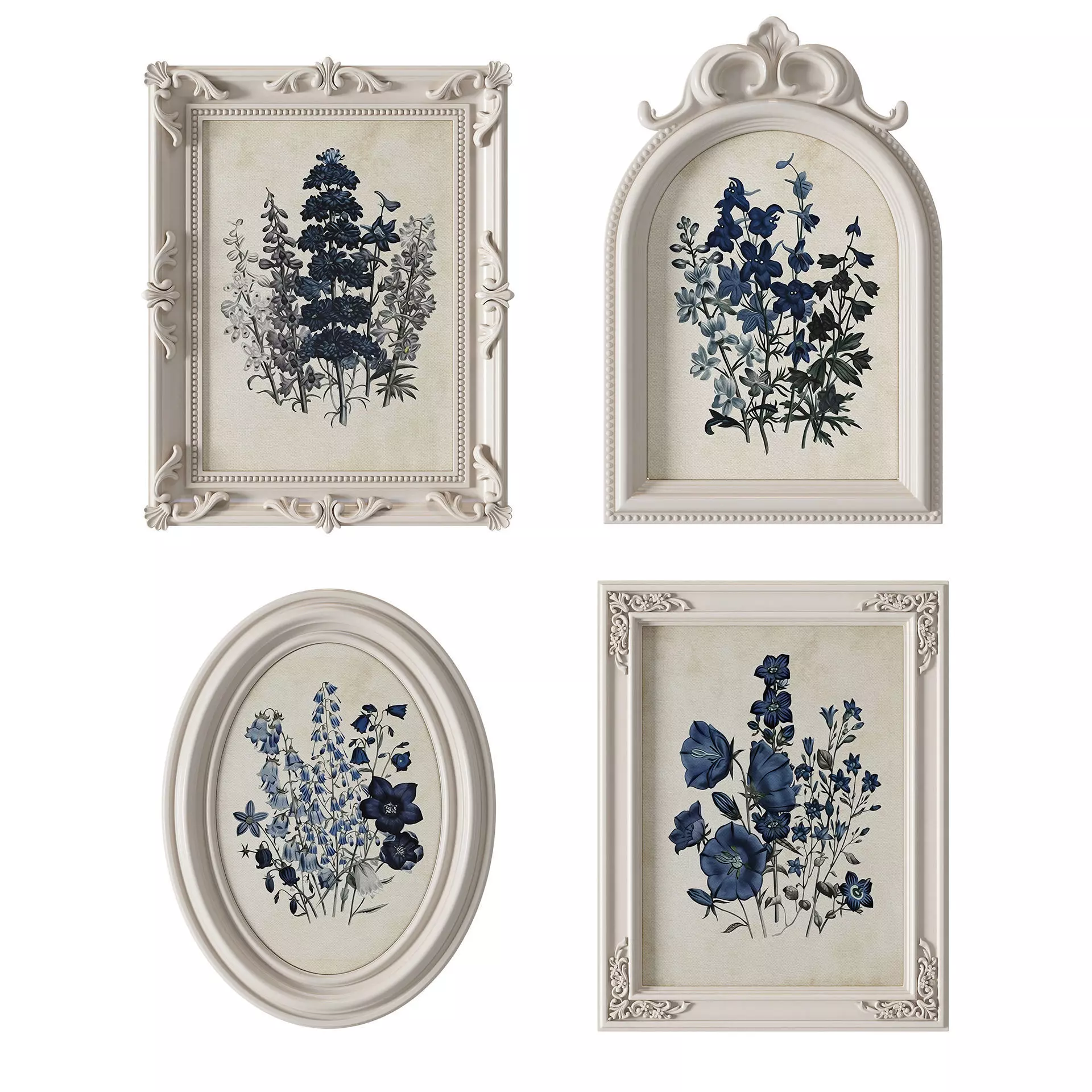 4 white frames in different shapes with floral prints in blue colors