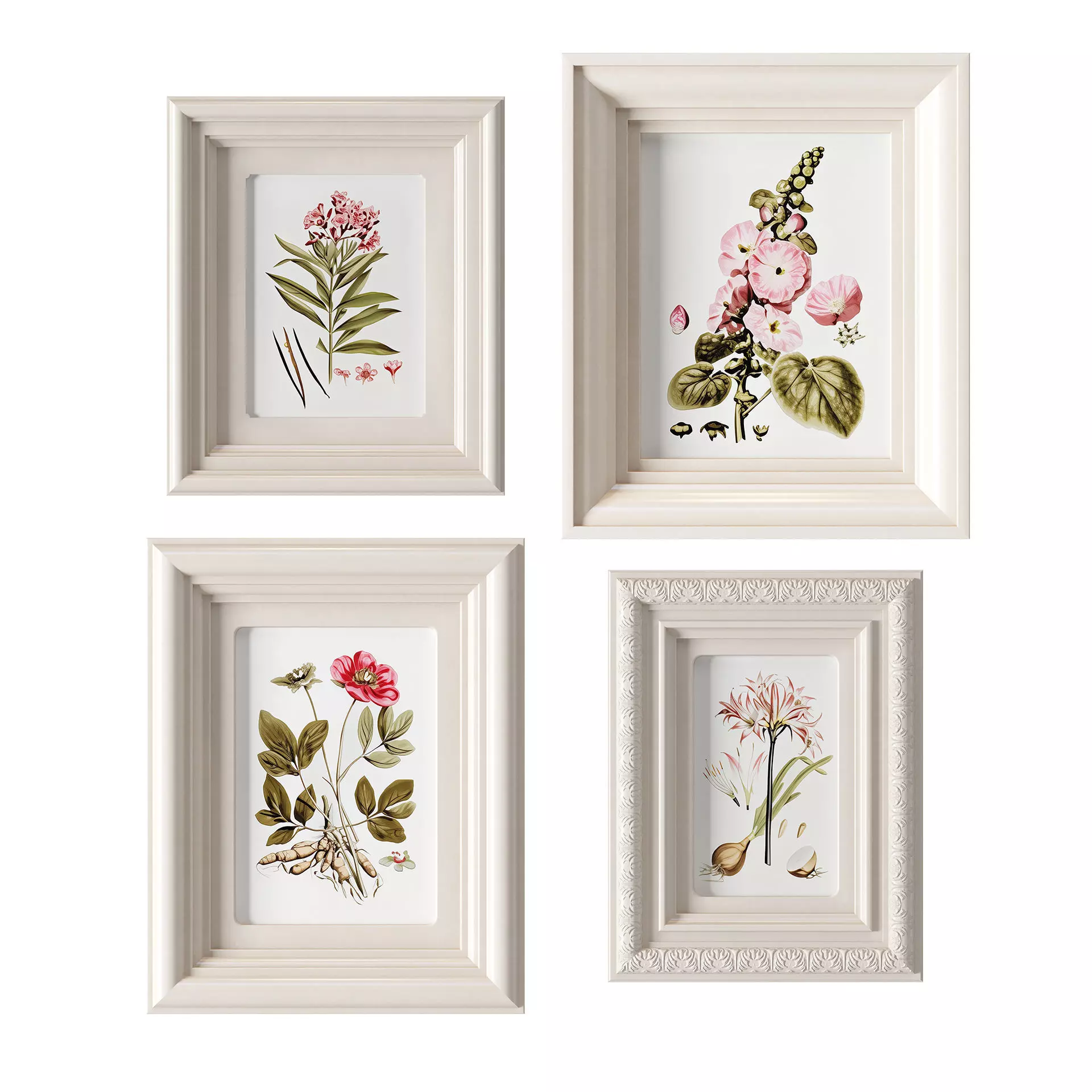 Classic pictures in classic white frames for interior4 white frames with floral prints in pastel colors