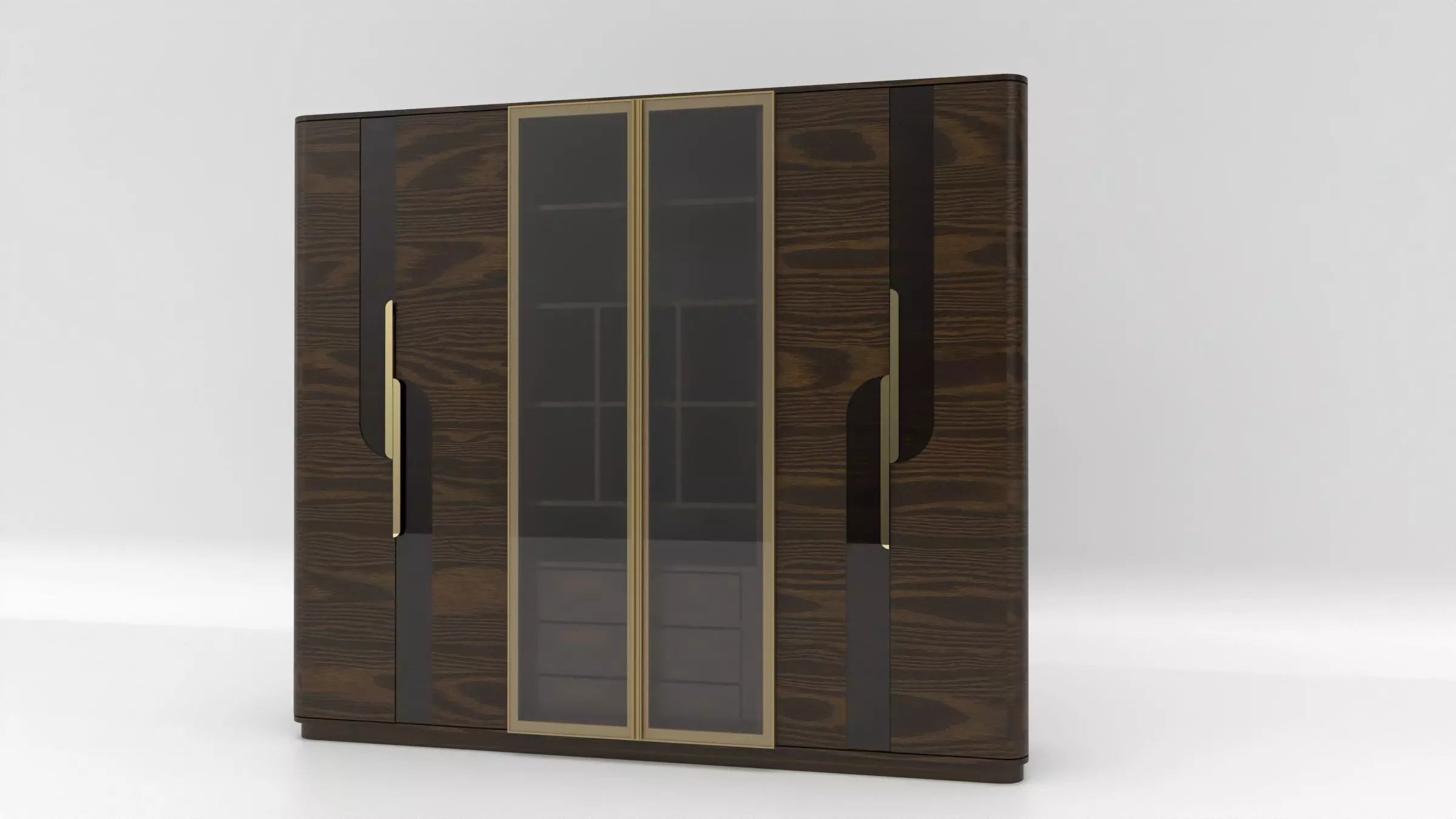 At the center, two framed glass doors with subtle gold trim add a luxurious focal point while allowing a glimpse into the interior shelving, enhancing realism and depth in your renders. The rounded edges and clean lines create a balanced silhouette, making this piece ideal for modern bedrooms, luxury apartments, and high-end interior visualizations.