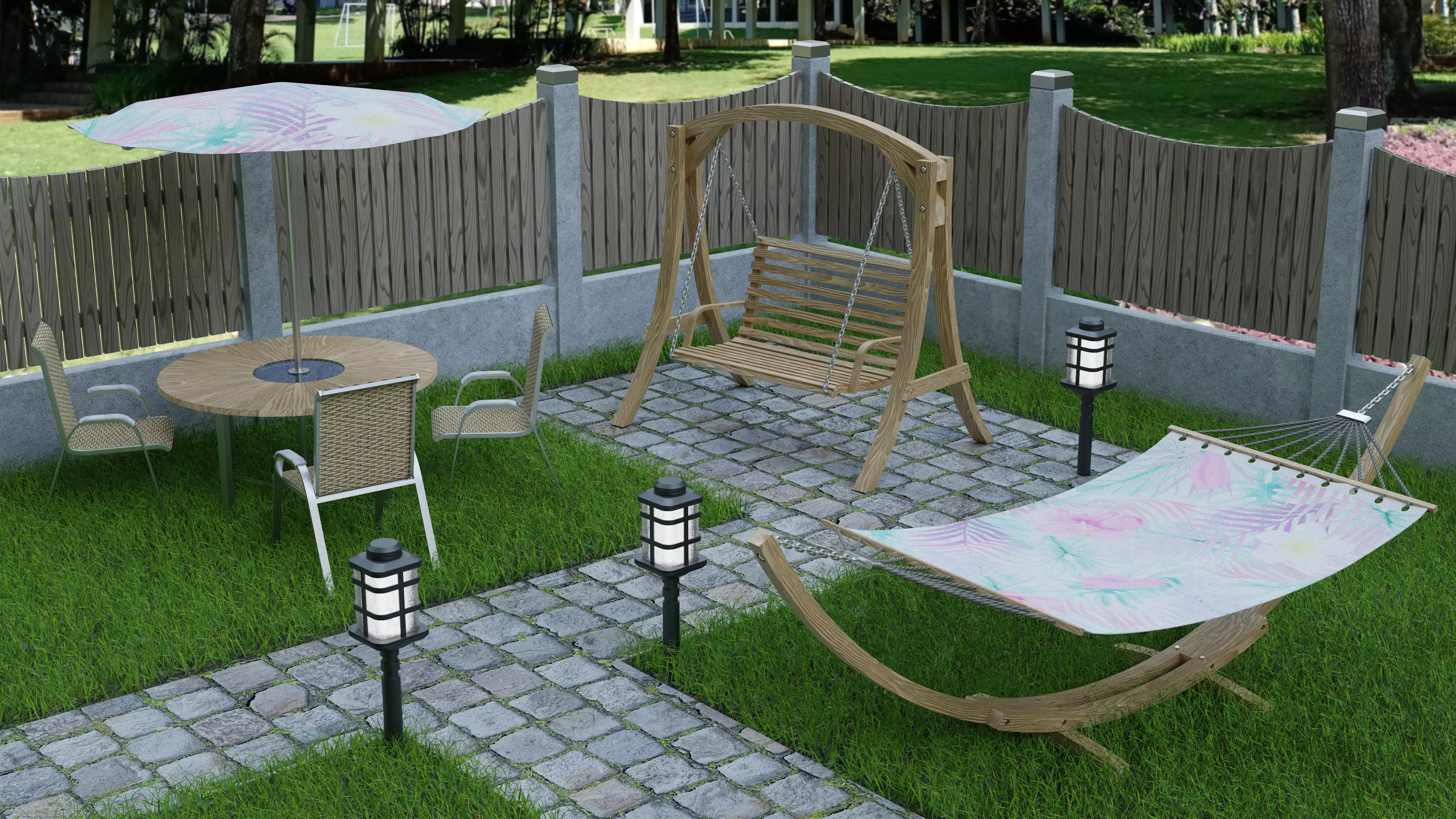 The models are relatively low-poly (except the gate and the ground which uses instanced foliage) and can be used as game assets.Polycount: swing - 55k, hammock - 22k, fence -1.3k, fountain - 10k, birdhouse - 1.5k, lamp - 5k, table and chair - 12k, gate - 6.2k (without instances), ground - 1k (without instances).
