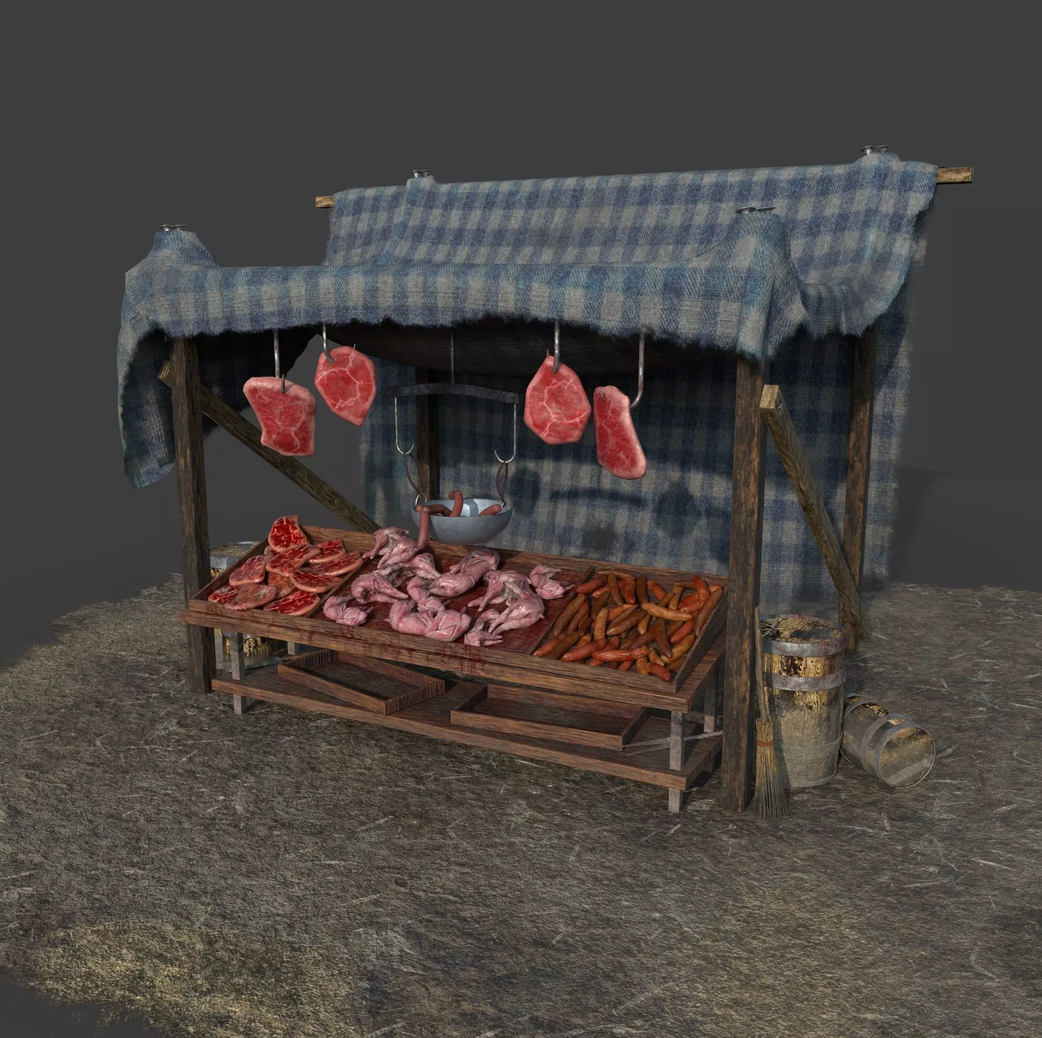 Medieval Style Meat Stall 3D Model PBR Texture available in 2048 x 2048 and 4096 x 4096 Maps include : Basecolor, Normal, Roughness, and Metallic. Model contains 13 Materials / Textures. One Model File. All Preview renders were done Marmoset Toolbag 3.08 Scaled to real world scale. Customer Service Guaranteed. From the Creators at Get Dead Entertainment. Please like and Rate! Follow us on FaceBook and Instagram to keep updated on all our newest models