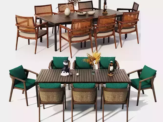 The set includes a wooden dining table, multiple wicker chairs with fabric cushions, a large outdoor umbrella, and carefully arranged decorative items on the table.All elements feature clean topology and realistic proportions, making the model suitable for both close-up renders and wide outdoor scenes.