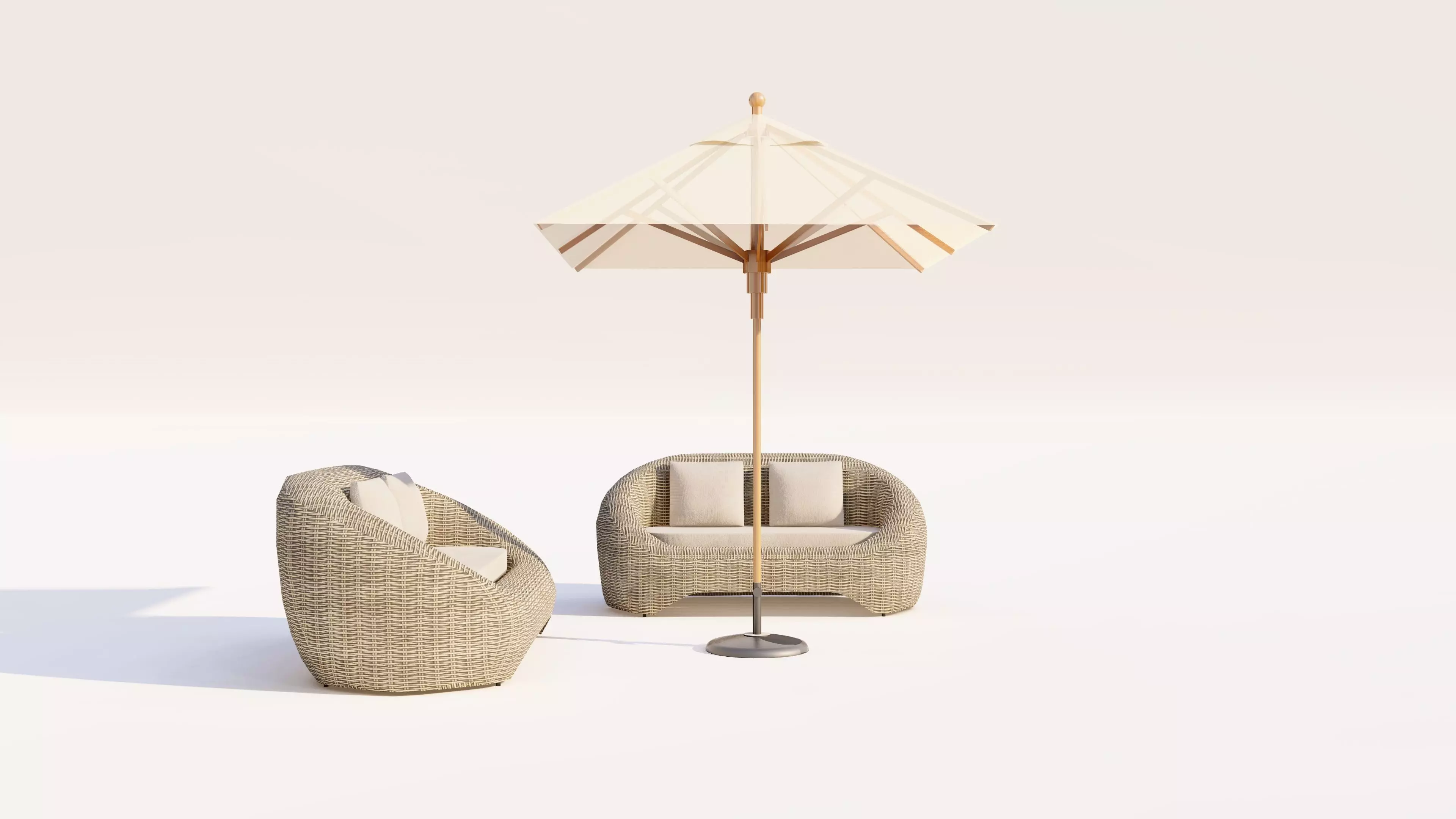 Weather-Resistant Finishes: Materials are calibrated to represent high-end outdoor finishes, including UV-resistant wicker and water-repellent fabrics.