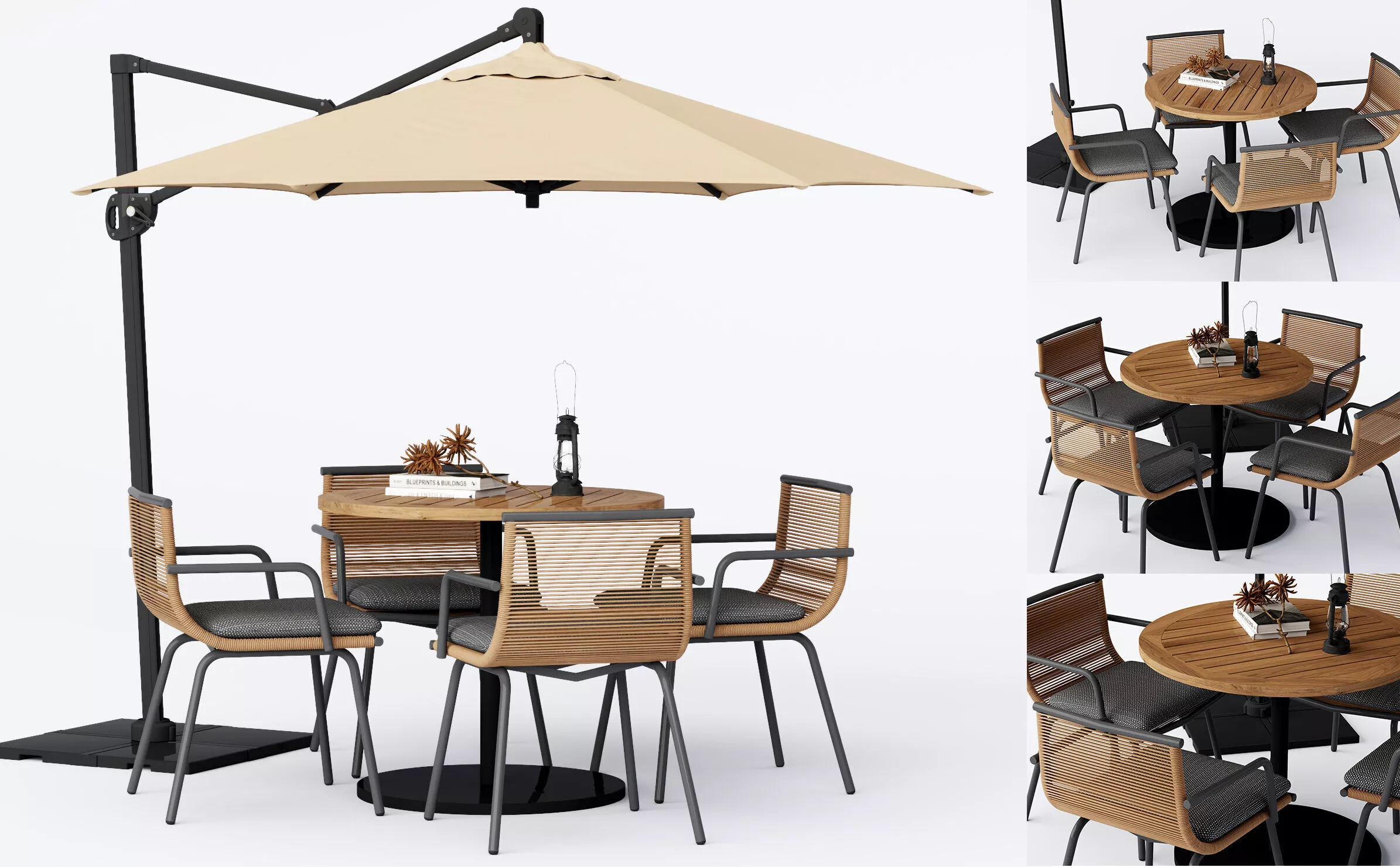 Professional high-quality 3D collection of a Modern Outdoor Dining Set meticulously crafted for premium architectural visualization and hospitality projects. This comprehensive asset features a circular wooden dining table paired with 4 stylish rope-woven armchairs including a large side-post cantilever umbrella and realistic table accessories such as books and a vintage lantern for enhanced scene atmosphere.