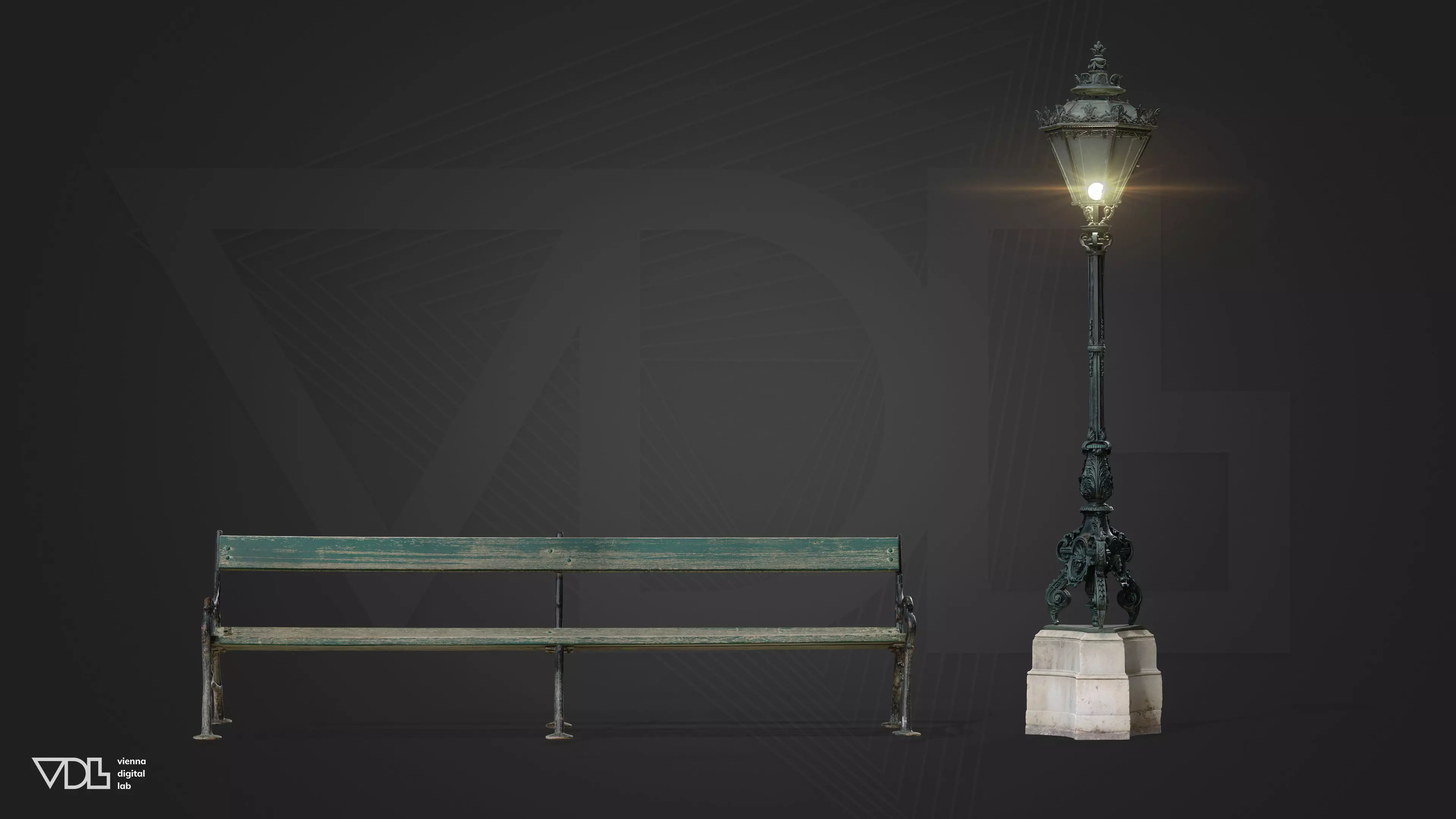 This combination of imperial street light and bench are original, hyper-realistic 3D scans from the Austrian Imperial Palace in Vienna, Austrias most prestigious cultural heritage sites and a central axis of influence on European history during the Habsburger Monarchy stretching from the late Middle Ages until the early 20th century. They are a testament to the Baroque era's artistic vision and the Habsburgs' desire to create a residence that exudes power, beauty, and sophistication. The ornamental design of the street lights includes motifs that are symbolic of power, nature, and mythology. The wooden bench, set in a wrought iron frame, is characterized by its unique traces of time making it rich in character and distinctiveness.