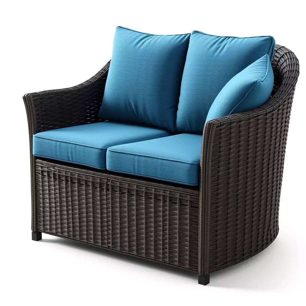 This is a meticulously crafted 3D model of an outdoor rattan loveseat, featuring a contemporary design with dark brown woven synthetic rattan and vibrant blue fabric cushions. The model accurately captures the intricate weaving patterns of the rattan and the soft texture of the cushions, providing a highly realistic representation suitable for various digital applications. It is ideal for architectural visualization projects, particularly for rendering exterior scenes such as patios, balconies, gardens, and poolside areas. The clean topology and efficient polycount make it suitable for integration into real-time environments, including game development, virtual reality (VR), and augmented reality (AR) applications, where performance is crucial without sacrificing visual quality. Furthermore, its detailed design lends itself well to high-quality static renderings for product presentations or digital art compositions. The model comes fully UV unwrapped with professionally optimized PBR textures, ensuring realistic material rendering under diverse lighting conditions. It is available in widely supported formats such as GLB, OBJ, FBX, USD, DAE, ABC, STL, and PLY, ensuring broad compatibility with most 3D software and game engines. This asset is ready to be dropped into any scene, enhancing your projects with a touch of modern outdoor comfort and style.
