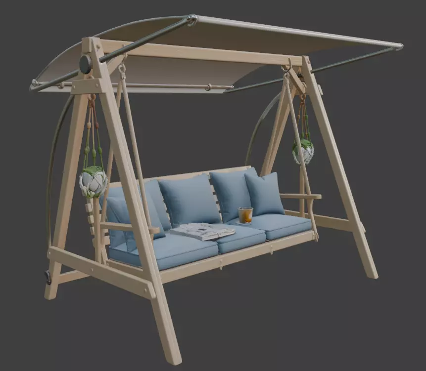 This clean and modern outdoor swing 3D model is perfect for your next project. It features a strong A-frame metal structure, thick cushioned seat with pillows, and sturdy black ropes. Great for garden scenes, patio renders, architectural visuals, or game environments. Comes with simple geometry and PBR textures for realistic results in any software. Easy to use in Blender, 3ds Max, Maya, Unreal Engine, Unity, and more. Multiple file formats included (FBX, OBJ, BLEND, STL, USDZ, GLTF.). Add this stylish swing to your cozy outdoor or living space designs today!