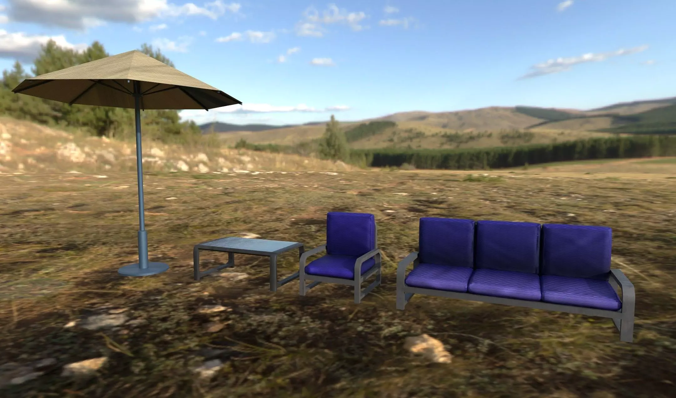 Outdoor patio furniture models. An umbrella with a black stand, a glass and metal table, a single seat metal and fabric chair, and a metal and fabric three-seat couch. All fully modeled, UV mapped, and textured. Faces: 2701Vertices: 2689