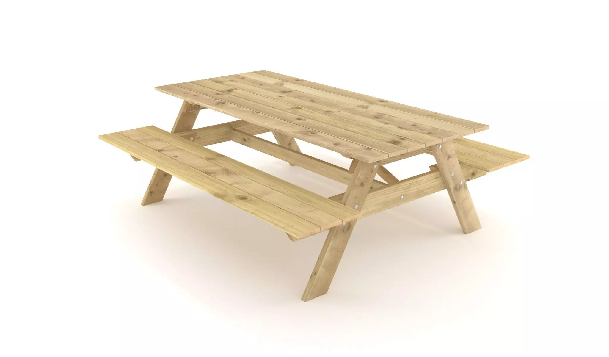 The model is split up into 4 seperate pieces: table top, seat, side and middle. The pieces are uvw unwrapped separately with realistic wooden textures (4096x4096 .jpg) for diffuse and bump maps. It's all held together with bolts and screws that has a basic metal material. The smaller screws in the planks are particularly nice to have visible when doing close up renders, but they can easily be hidden or deleted for even lower polygon count, as the are all one separate layer.