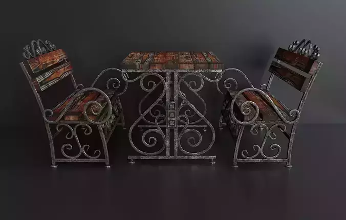 Old table with wrought iron benches with top and seats made from old boards. (exterior set. park, garden, veranda, etc.) The set consists of three items: a table and two benches. (three objects - three meshes. Without binding to each other) The texture (old wood) is packed in a zip archive.