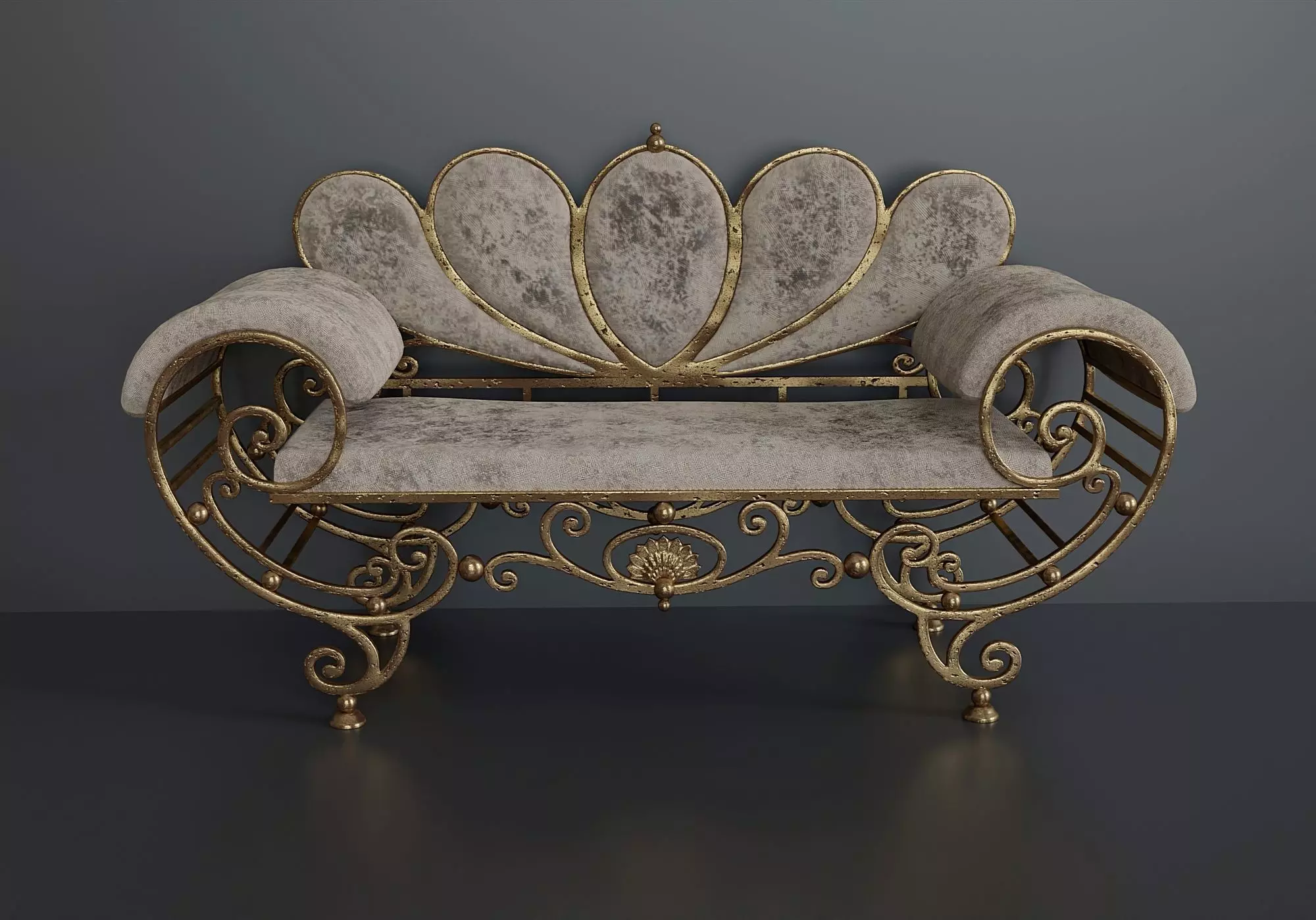 Antique wrought iron sofa with upholstered armrests and seat. The model consists of separate (Unrelated) objects. Metal body and soft upholstery. (each fabric element is a separate mesh) Textures (fabrics) were baked in substance painter. (Texture resolution 2048x2048) (Base color,Height,Metallic,Mixed AO,Roughness,Normal,Normal OpenGL.) All textures are packed in a zip archive.