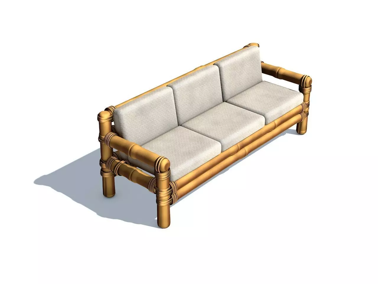 Simple model of a bamboo sofa, created in Cinema 4d. All Shaders work in .c4d, for the other export formats you will need to adapt it a bit. Clean model with a medium amount of polys. No bad geometry afaik. Polycount can easily be raised with a Hypernurb for a more precise model. This is part of a series of bamboo furniture which I have been using to illustrate the house I'm building right now.