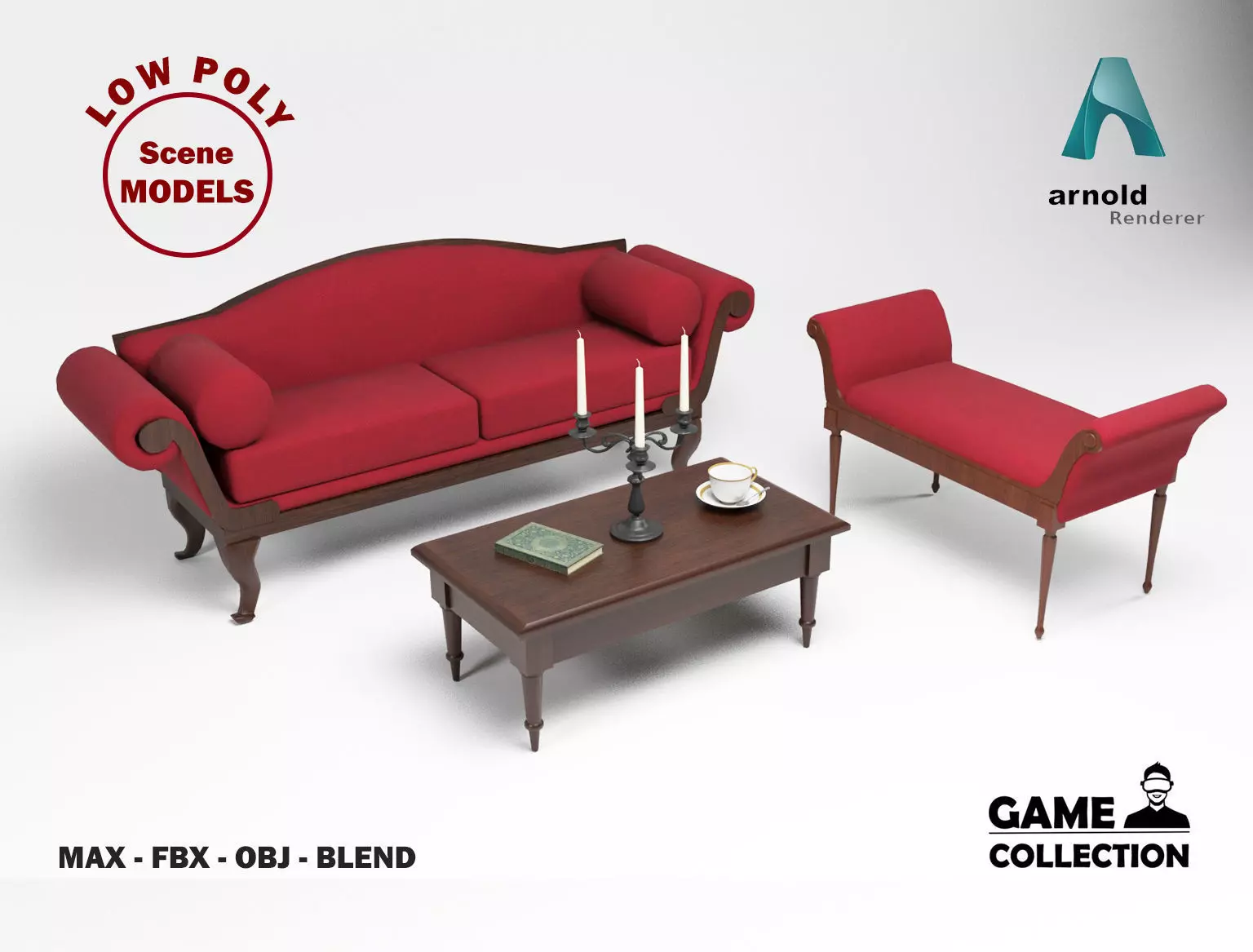 3D Models of a British antique furniture (sofas, table and objects). The models has been created with 3D Studio Max 2022 and Blender 3.3. All the models are low poly, basic but realistic and are ideal for 3D scenes that require few polygons. They can be used for advertising visualitations and also for games or applications. It has been created in different 3D Studio Max versions and also in FBX, OBJ and blend.