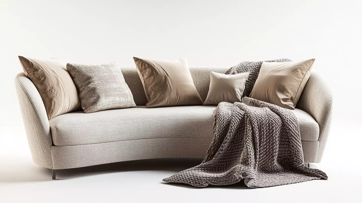 • Design: A curved and elegant form with a neutral beige fabric, complemented by plush cushions and a textured throw blanket for added realism.