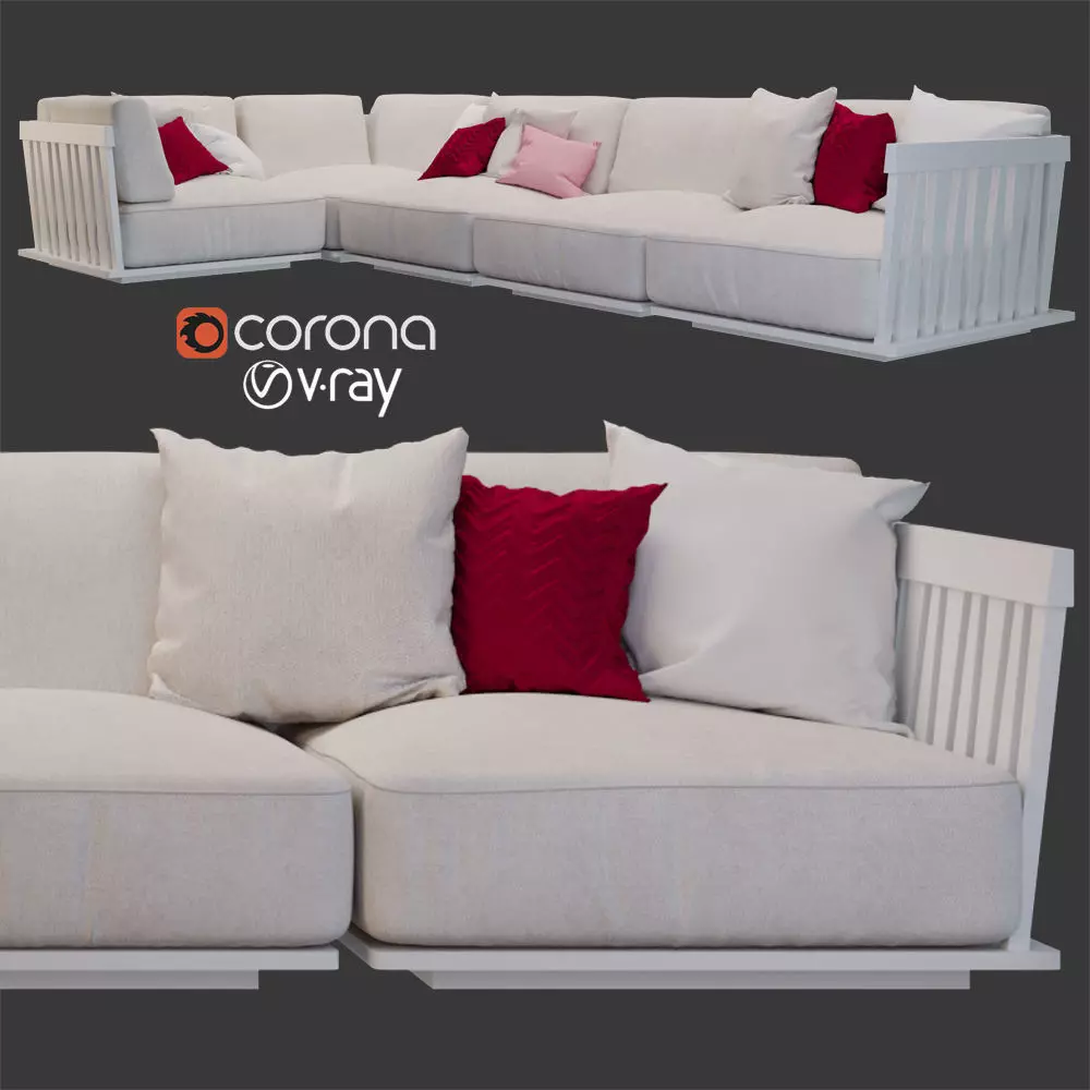 The base of the Zante sofa is made entirely of Okoume marine plywood, perforated to allow better aeration of the cushions. The upper part is in iroko veneer, to match the structure of the backrest and armrests, which are made entirely of solid iroko, with a unique design of hand-fitted interlocking strips of irregularly shaped wood. The sofa sits on a perimeter frame in austenitic stainless steel 316 which is lifted off the floor by nylon pads.