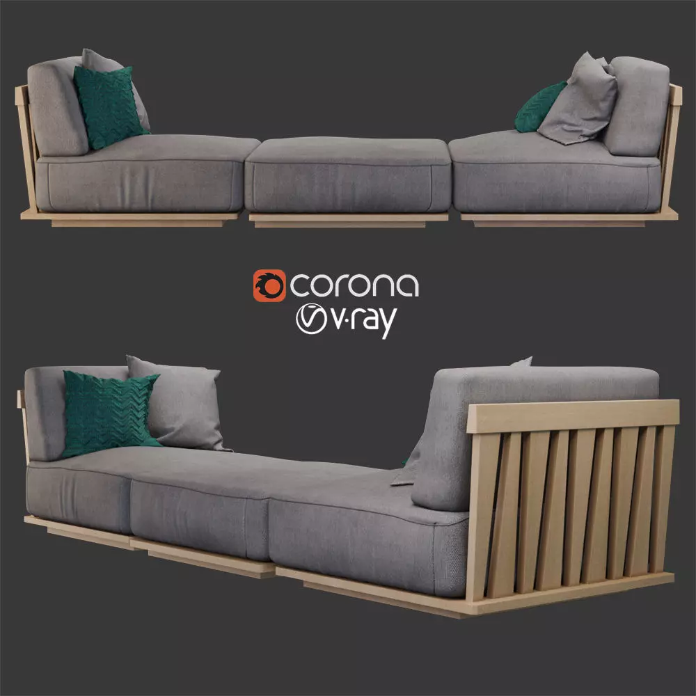 The base of the Zante sofa is made entirely of Okoume marine plywood, perforated to allow better aeration of the cushions. The upper part is in iroko veneer, to match the structure of the backrest and armrests, which are made entirely of solid iroko, with a unique design of hand-fitted interlocking strips of irregularly shaped wood. The sofa sits on a perimeter frame in austenitic stainless steel 316 which is lifted off the floor by nylon pads.