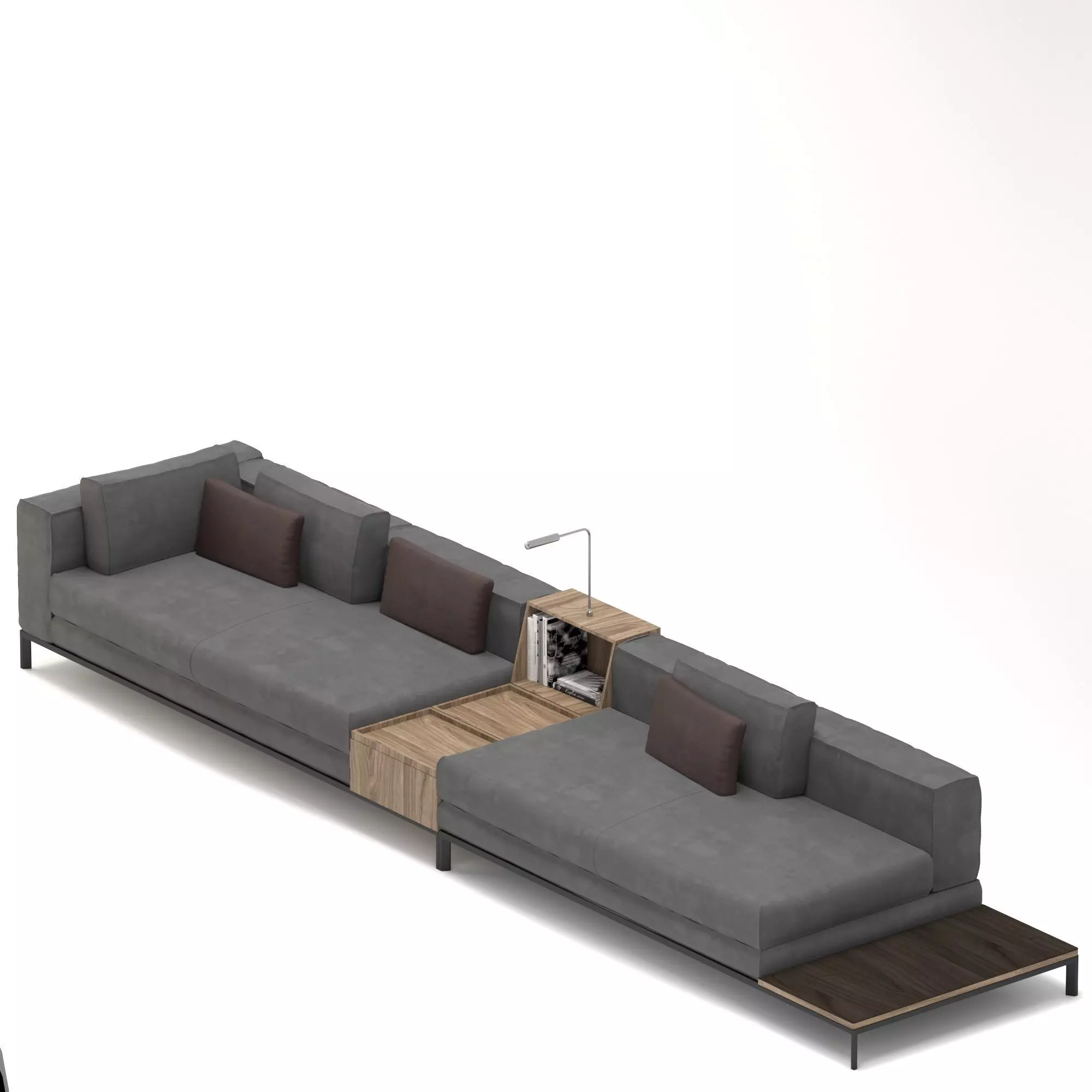 On site descriptio_A joyful ensemble of volumes, partitions, tables, and hidden compartments: Taylor comes in two depths with or without backrest-raising mechanism, and can be made over in such a way as to be a continuous surprise: an exciting, customized set that reflects the aesthetic tastes and practical needs of households and ambiences.Rigorous yet soft. Geometric, but with surprisingly uneven shapes. Proudly ranked among the true items of furniture, the Taylor sofa rests upon a cast aluminum base and can be enhanced with dividers and container units between seatings. It can also be fitted with a wooden frame skirting the entire perimeter acting as handy surfaces bric-à-brac, bookcases, libraries, shelves, or even leather-upholstered coffee tables or sofa-matching furniture accessories. _