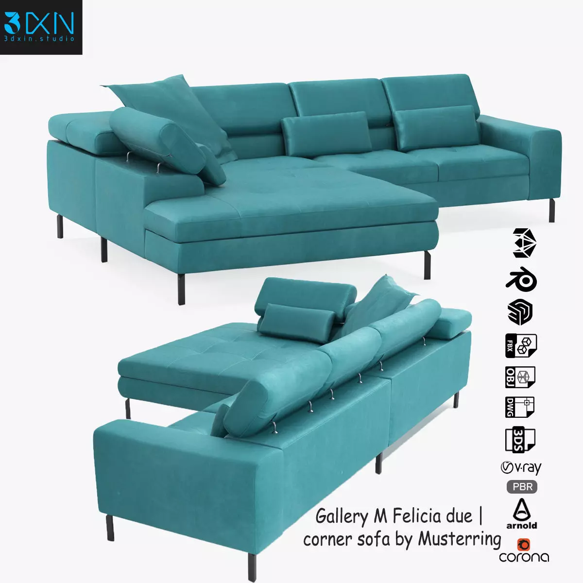 Gallery M Felicia due | corner sofa by Musterring is a high quality, photo realistic 3d model that will enhance detail and realism to any of your rendering projects. The model has a fully textured, detailed design that allows for close-up renders, and was modeled in 3ds Max 2018 also has 3ds Max 2015 version and rendered with V-Ray. Renders have no post-processing.