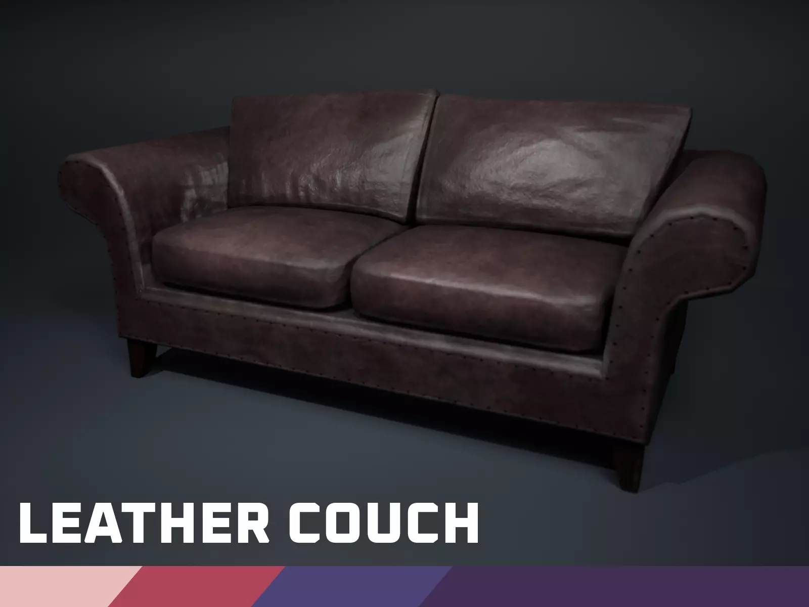 A realistic two-seater leather sofa designed with a classic and timeless aesthetic. This asset features worn leather upholstery with subtle surface imperfections, visible stitching, and metal studs along the lower frame and armrests, giving it a grounded and authentic appearance.The cushions and backrests are slightly deformed to simulate real use, while the leather material shows natural aging, wrinkles, and roughness variations.