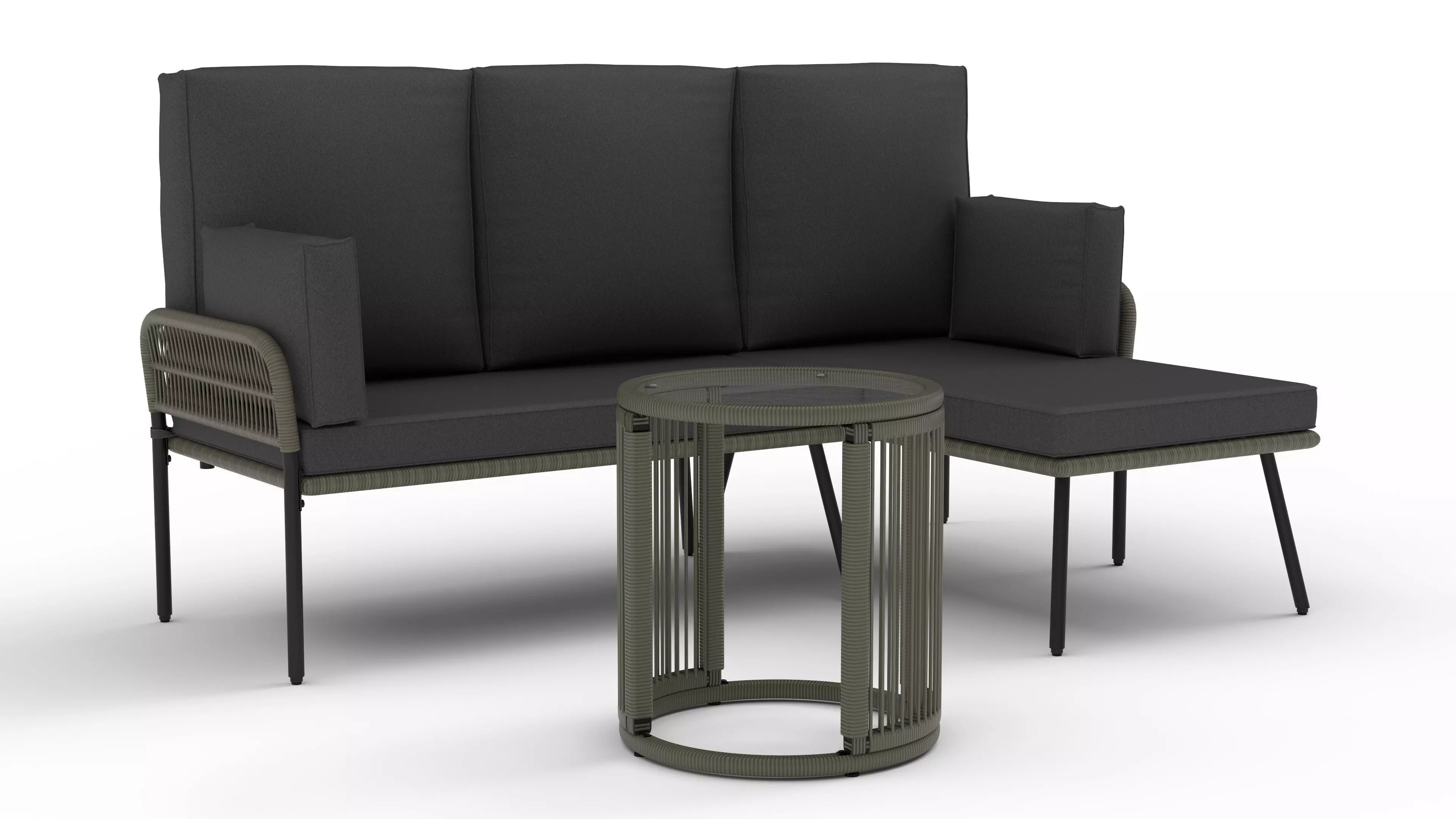 This detailed 3D model of a modern outdoor patio sofa set is perfect for architectural visualization, furniture renders, product showcases, and interior/exterior design projects. The model includes a 3-seater cushioned sofa with a lounge extension and a round side table with detailed rope-style weaving.