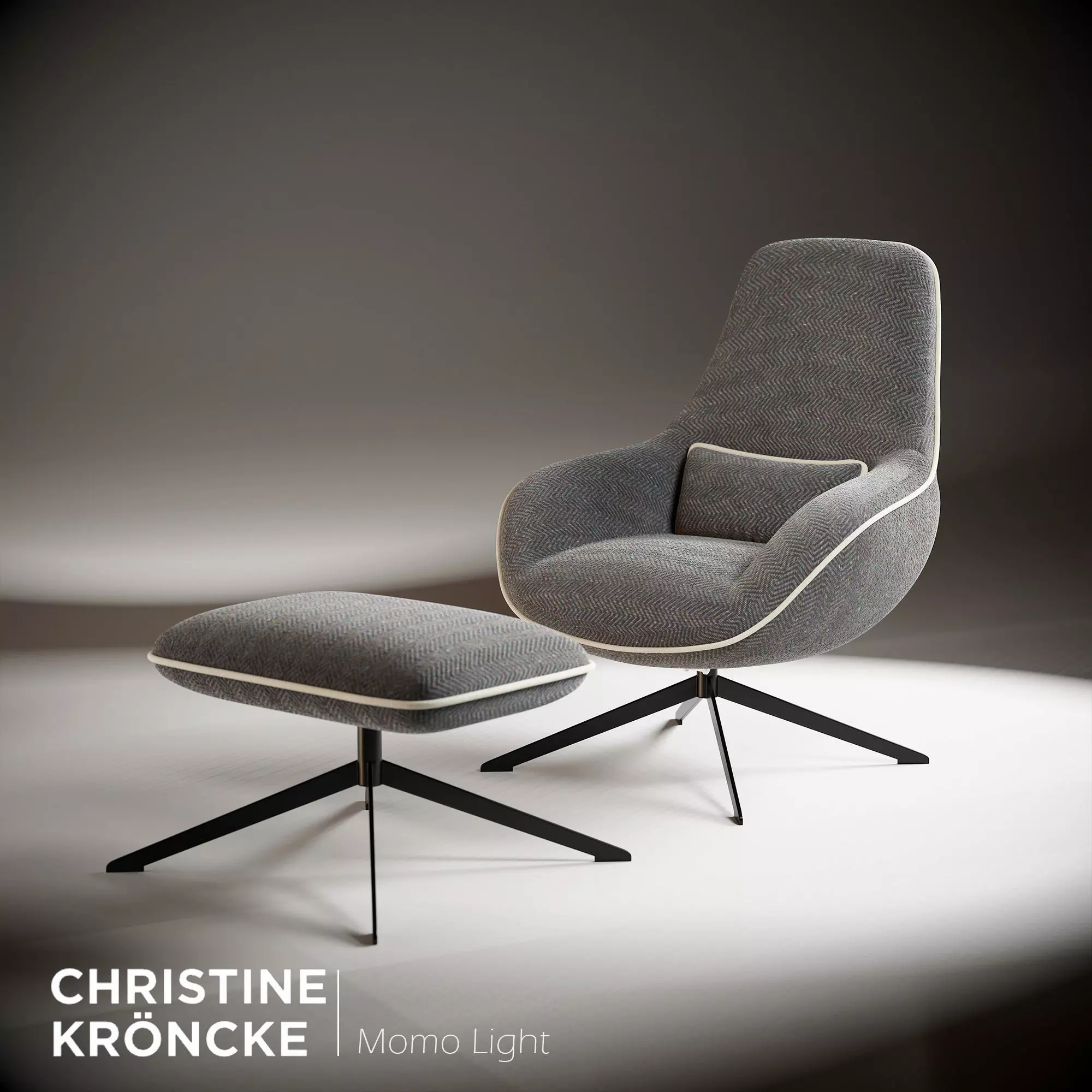 High-quality 3D model of the Momo Light lounge chair and ottoman, designed by Bastian Prieler for Christine Kröncke. This model is perfect for interior renderings, product visualizations, and modern living scenes.