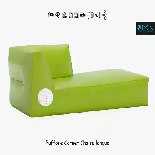 Puffone Corner Chaise Longue Olive Green is a high-quality, photo-realistic 3d model that will enhance your rendering projects' detail and realism. The model has a fully textured, detailed design that allows for close-up renders, and was modeled in 3ds Max 2018 and has a 3ds Max 2015 version, and rendered with V-Ray. Renders have no post-processing.