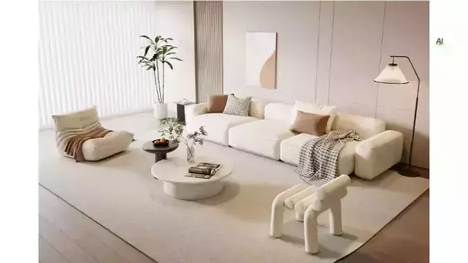 This is a modern minimalist living space, primarily featuring beige, light apricot, and natural wood tones, creating a soft, relaxed, and sophisticated ambiance.Core furniture:The main piece is a set of beige modular sofas, paired with light brown and plaid cushions, with a matching plaid blanket draped on one side. The rounded, full lines combine comfort with a sense of design.On the left is a creamy-colored recliner sofa, casually draped with a caramel-colored knit blanket, exuding a lazy yet cozy ambiance.In the center is a round white coffee table, flanked by a small dark gray round side table adorned with fruits, magazines, and a transparent vase filled with greenery, exuding refined details.In the foreground stands a uniquely designed white tubular art chair, adding a modern artistic touch to the space.Soft Furnishings and Atmosphere:A large area of light beige carpet is laid over the light wood-toned floor, softening the rigidity of the space.The background wall features light gray vertical-textured panels paired with a minimalist abstract painting, enhancing the overall texture.On the right side stands a black metal floor lamp with a beige fabric lampshade, casting a soft glow.Beside the window is a set of white vertical blinds paired with a tall potted green plant, adding a sense of breathability to the space.The overall design is clean and crisp, devoid of unnecessary embellishments. Through the softness of materials and the unity of colors, it creates a modern home scene that is both comfortable and stylish.