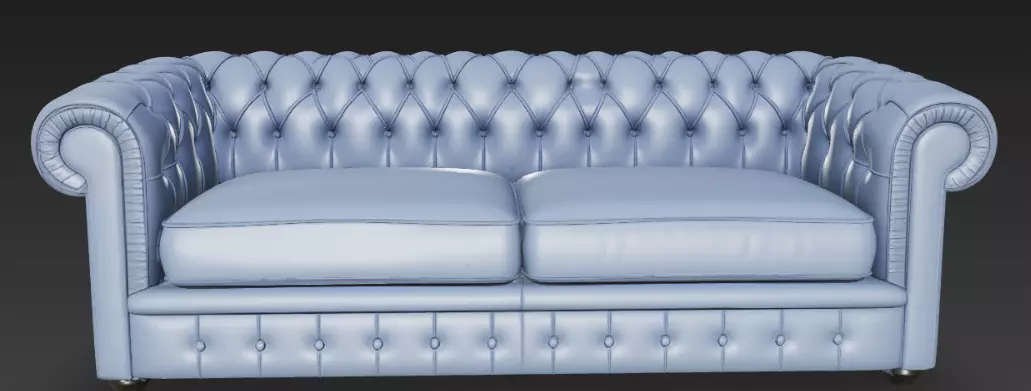 This 3D model showcases a stylish blue Chesterfield sofa with detailed tufting, rolled arms, and solid wooden legs, perfect for modern interior design projects. The model features smooth leather textures and a sophisticated design, ideal for virtual staging or upscale furniture visualization.