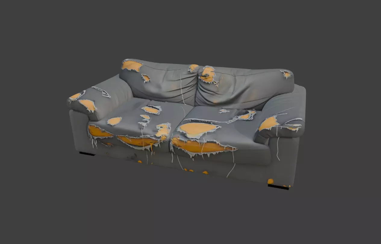 The silhouette remains believable and grounded. Cushion compression, fabric wrinkling, and edge tearing are sculpted carefully to avoid artificial repetition. The damage appears organic rather than procedural, which enhances immersion in narrative-heavy scenes.