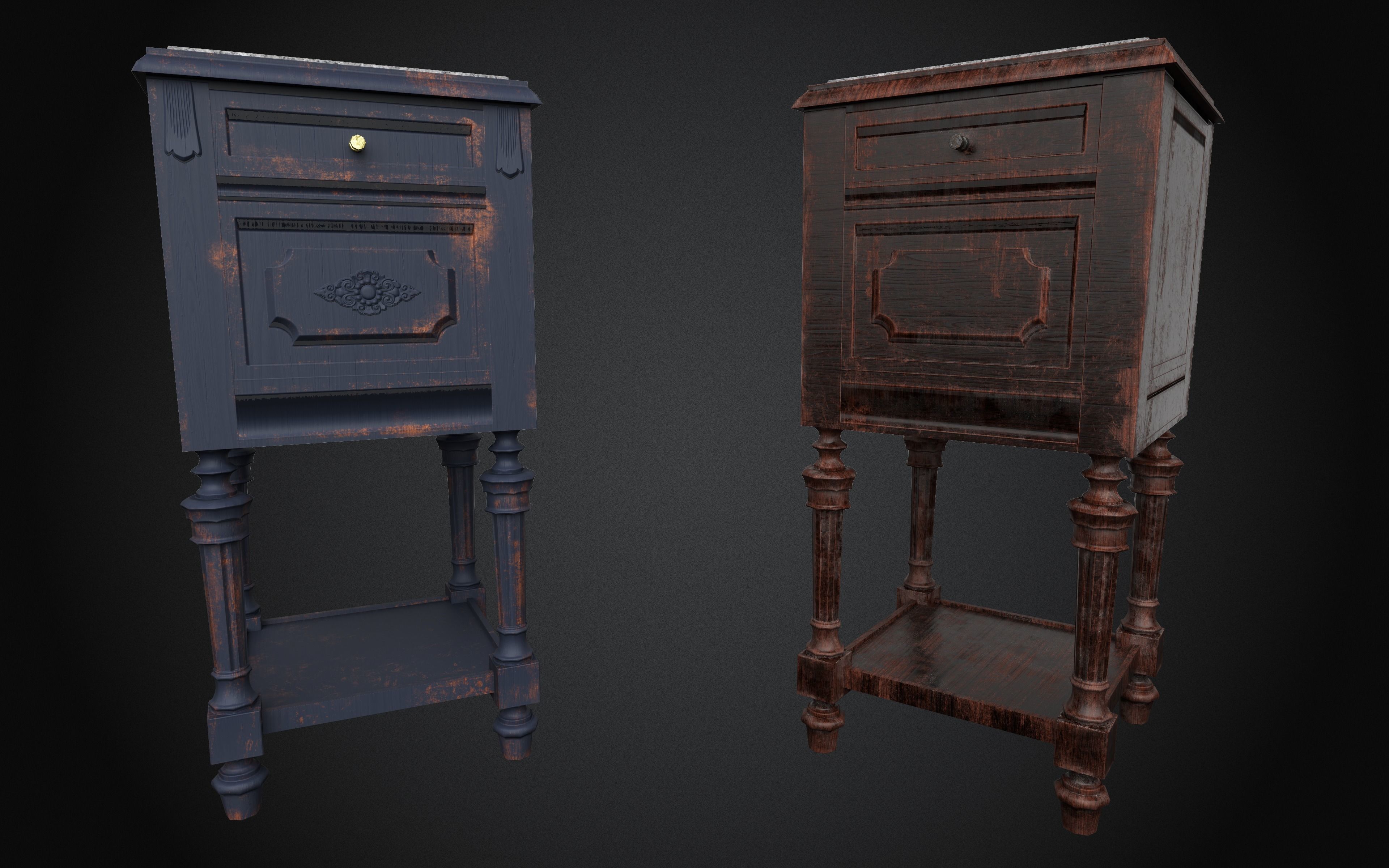 Here is a game ready nightstand/end table made with the utmost care to obtain a standard that is both visually exquisite and performance friendly for real-time applications. The model itself has two different texture sets showcasing two different designs to allow the model to be used in a more versatile manner. Each set's textures are all 4K to allow for the highest possible detail to shine. Each texture set comes with both the original TIFF format textures (Uncompressed) as well as their TGA equivalents, for use in a game engine (UE4/Unity). All the texture maps adhere to the following naming convention: - *_Albedo (The Color/Base/Albedo Map) - *_NRM (The Normal Map - DirectX - Invert Green Channel for OpenGL) - *_Rough (The Roughness/Microsurface Map) - *_Metal (The Metallic/Metalness Map) - *_AO (The Ambient Occlusion Map) - *_ARM (A map containing the previously mentioned AO, Roughness, and Metallic maps into each of the images individual channels of a single image. Conserving texture memory in certain applications (UE4 for example.) The ARM suffix corresponds to RGB in that: Red Channel = Ambient Occlusion Green Channel = Roughness Map Blue Channel = Metallic Map) UE4.zip - The UE4.zip contains an already setup version of the model for use in Unreal Engine 4, this includes textures and materials and accurate model scale but does not include custom collision or LODs.) Simply merge the Content and its contents from within the zip file and merge it with your current project's Content folder. It should automatically detect the files immediately or on the next time you launch the engine. Technical Note: If the model is displaying oddly in whatever rendering software you're viewing it in, make sure the software's Tangent Space is set to MikkT, if there is such an option. As this model was designed and created using MikkT tangent space. In almost all cases this shouldn't be an issue since MikkT is widely considered to be the standard tangent space encoding method. UE4, Substance Designer, and Substance Painter all use MikkT by default.