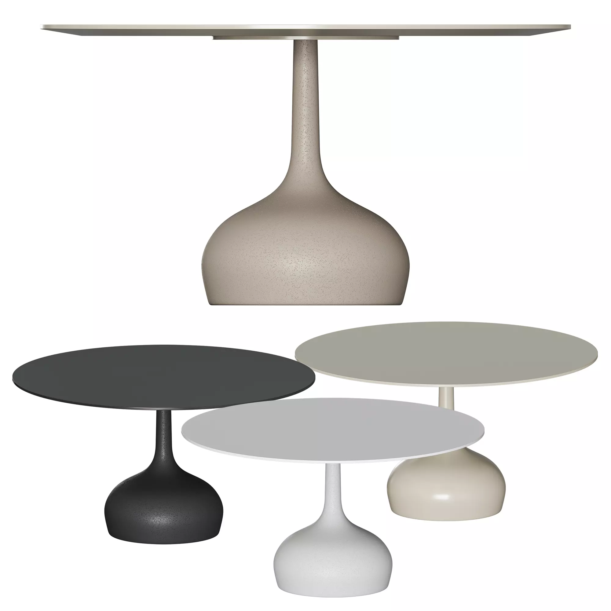 The SAEN is an inverted bowl that rests most of its weight directly on the floor, eliminating the need for a low center of gravity. The base is made of compact rigid polyurethane, a high performance material with advanced technical and aesthetic properties. Technopolymer, in fact, creates a perfectly clean and even surface while maintaining the concrete silhouette of the original project. The textured paint stem is supported by variously shaped MDF or varnished wood countertops in various finishes.Conceived as a dining table for the modern home or for contract use, the saen is available with a round table top with a diameter of 140, 160 or 180 cm.Lightness and heaviness merge in a striking stylistic oxymoron thanks to the results of technological research that allows Alias to create objects that reveal a sculptural soul
