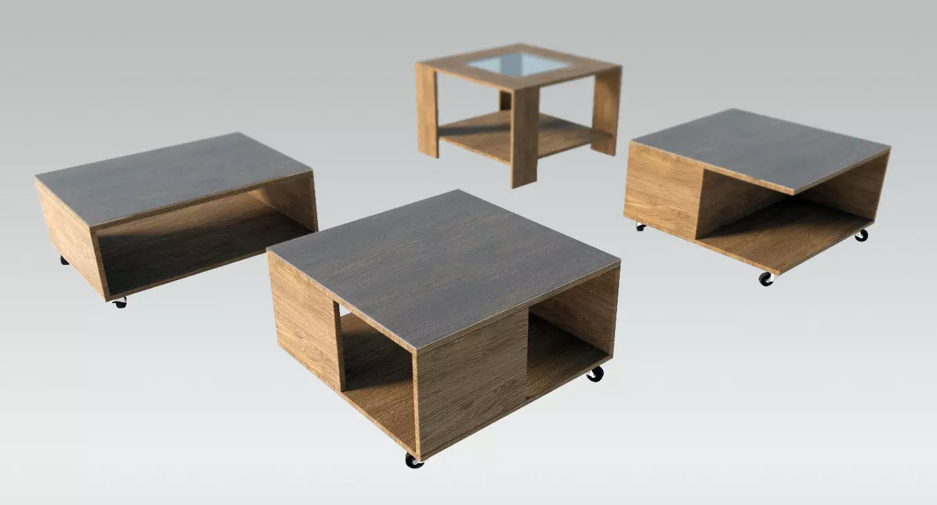 These are 4 coffee tables. One exists as a product, and the other 3 I have designed by myself, searching for the best form for my living room. All of them feature simple or elegant design, with oak and glass as main materials. They can fit very nice into modern ambient, Scandinavian design and so.