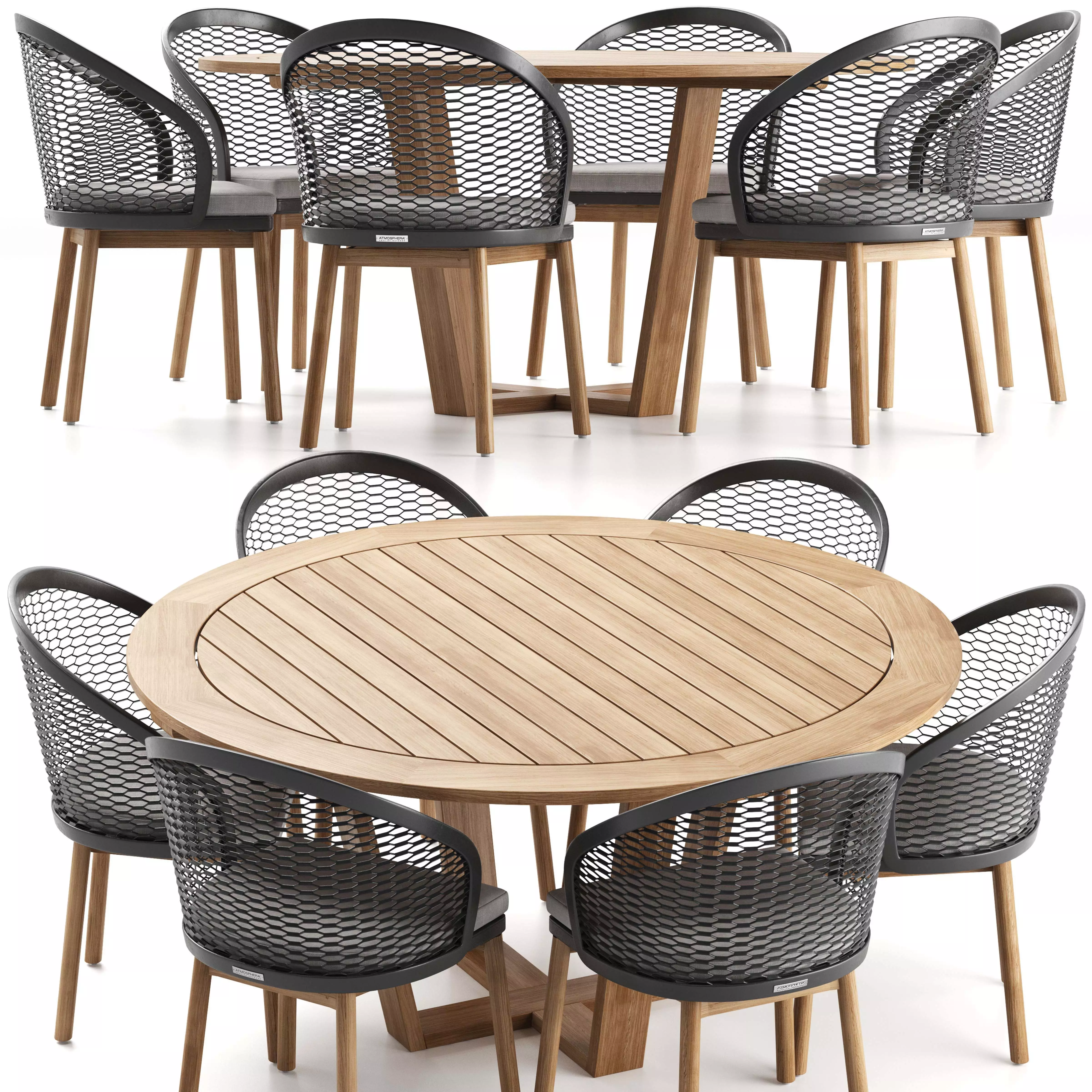 Atmosphera dining set 3D model, outdoor table and chairs 3Ds Max, wooden round table OBJ, V-Ray Next dining furniture, patio dining set 3D.