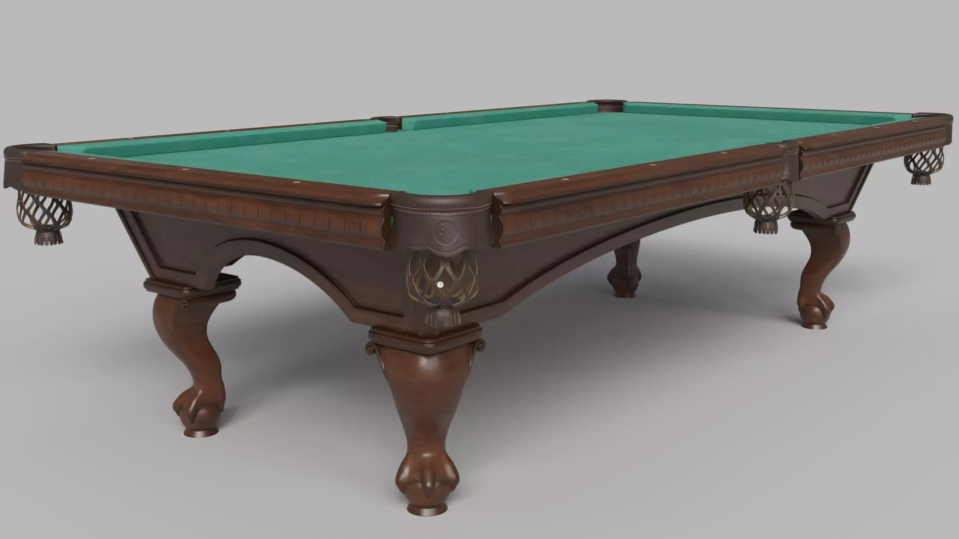 A detailed model of a billiard/pool table. It features a solid wood main frame with it's inner connections and a ball and claw legs.
