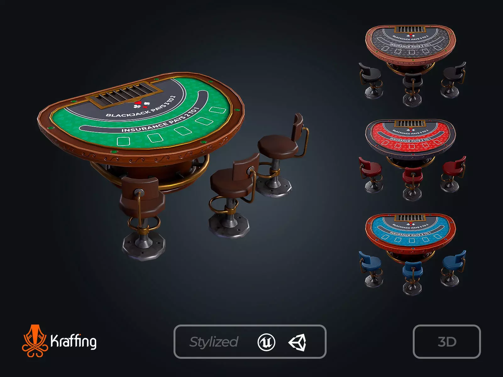 Kraffing presents a 3D modeling Blackjack Table V1. Recreated design so you can use it in personal projects, scenes, videogames and more.