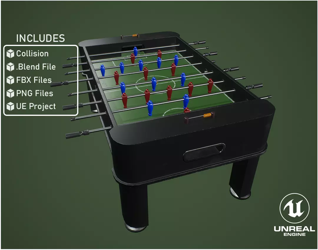 Classic Foosball Table with 9 Separated Pieces including Players and Ball with PBR Textures. Suitable for any scene. Ready to use in any project.