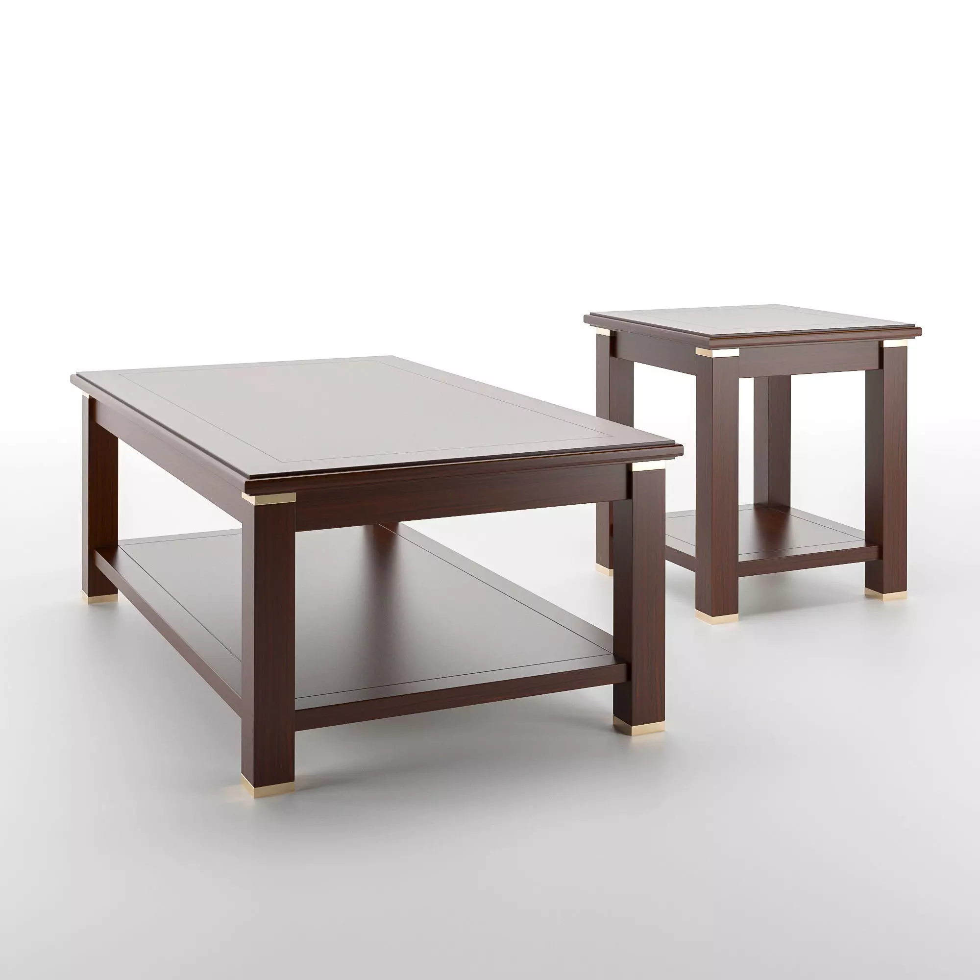 Here is a wooden table design with golden brass metal accents that I created for use in reception rooms, living rooms, or high-end executive lounges. You can also use it for other purposes. I designed it using 3ds Max with precise dimensions: (Large table: W700mm x D1200mm x H450mm) and (Small table: W500mm x D500mm x H550mm), based on actual manufacturing specifications provided by the supplier.