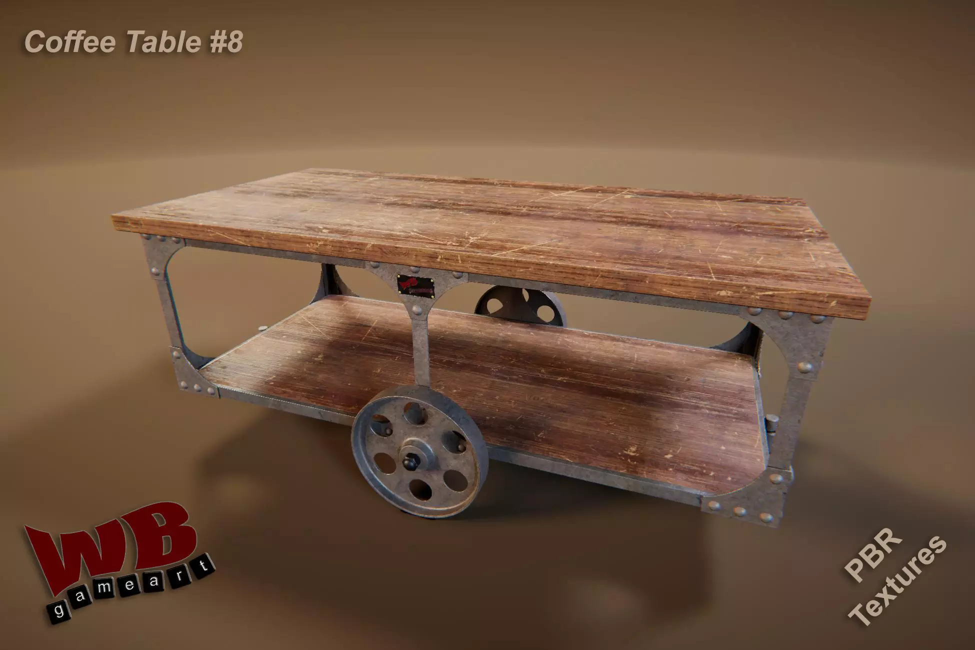 Built with a worn wooden surface and a rugged metal frame, this low-poly model features large spoked wheels and functional-looking rollers, making it ideal for factory-inspired environments, loft apartments, or vintage-style cafés. Scratches, rivets, and detailed weathering bring realism and texture, while the lower shelf adds visual and structural depth.