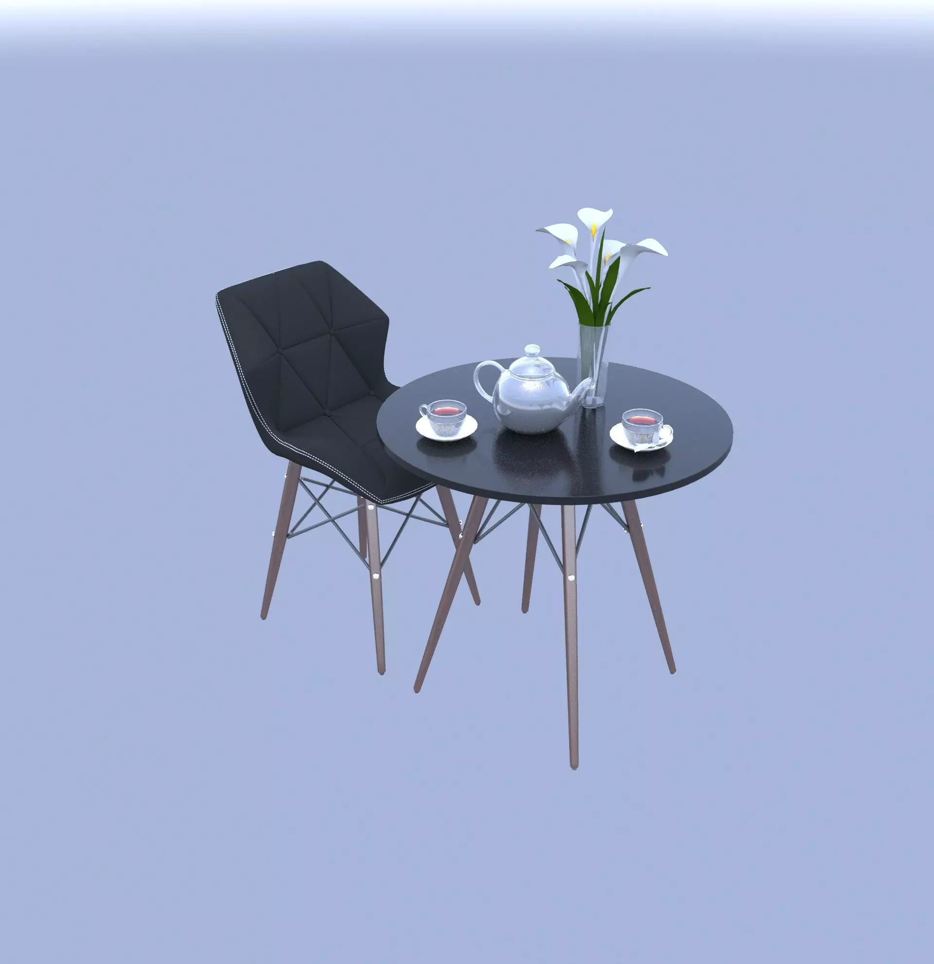 Round dining table: a modern round table with a dark gray or black table top that has a matte texture. The table is supported by four sophisticated wooden legs that diverge down, giving it a light and elegant appearance. The table diameter is ideal for two people, creating an intimate atmosphere.Design chair: a comfortable and stylish stool with a dark gray or black seat and back. The seat upholstery has a unique geometric stitched pattern that adds textures and modernity. Gentle wooden legs with metal connections in the form of a grid provide stability and attractive appearance.Tea service: a detailed kettle with a metal glare, as well as two elegant tea cups with saucer, ready for use in your stage.Decor: a vase with two realistic white flowers of calves that add life and freshness of the composition.Model features: